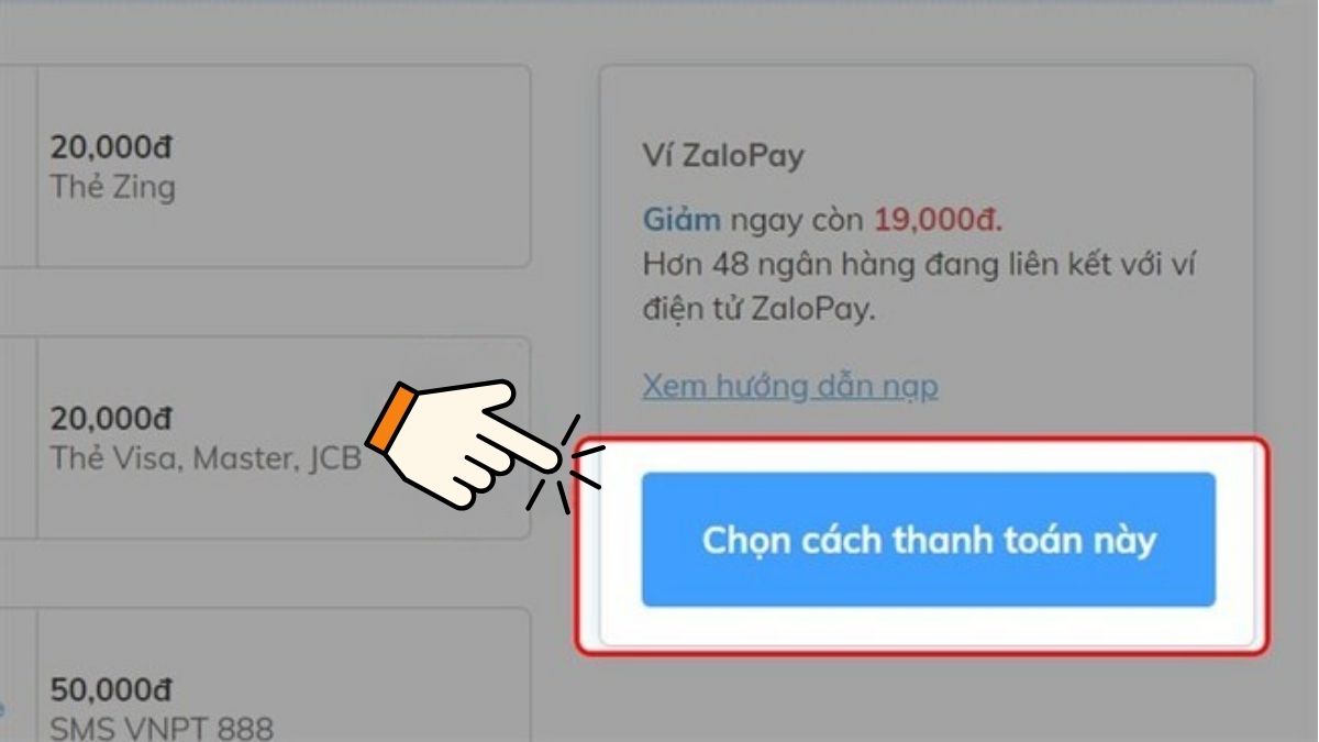 Bước 4: Tại giao diện thanh toán, chọn 'Ví Zalo Pay'. Sau đó, nhấn 'Chọn cách thanh toán này'. Cách nạp thẻ game này yêu cầu bạn phải có sẵn tiền trong tài khoản ZaloPay trước khi nạp Gunpow.