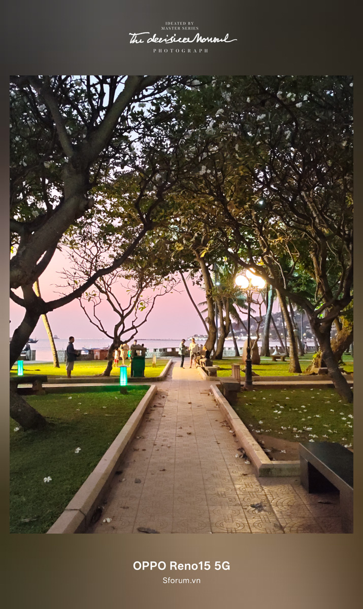 Trời lúc này đã chập tối, mình tiếp tục chụp thêm để kiểm chứng khả năng chụp hình thiếu sáng của OPPO Reno15. Thời điểm này mình đang cuốc bộ trở về công viên Bãi Trước, vừa tranh thủ chụp vừa để chuẩn bị lấy xe ra về.