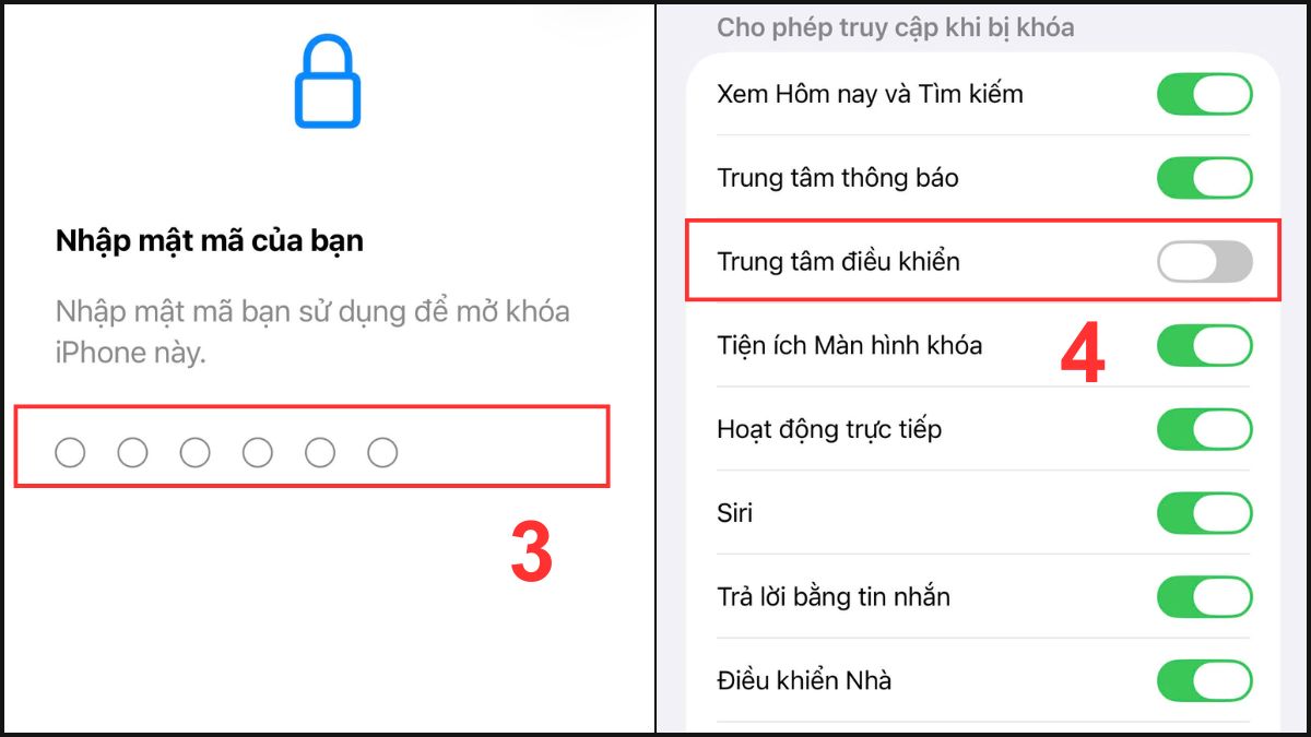- Bước 3: Ở khu vực Cho phép truy cập khi bị khóa, gạt công tắc ở mục Trung tâm điều khiển sang trái để tắt.