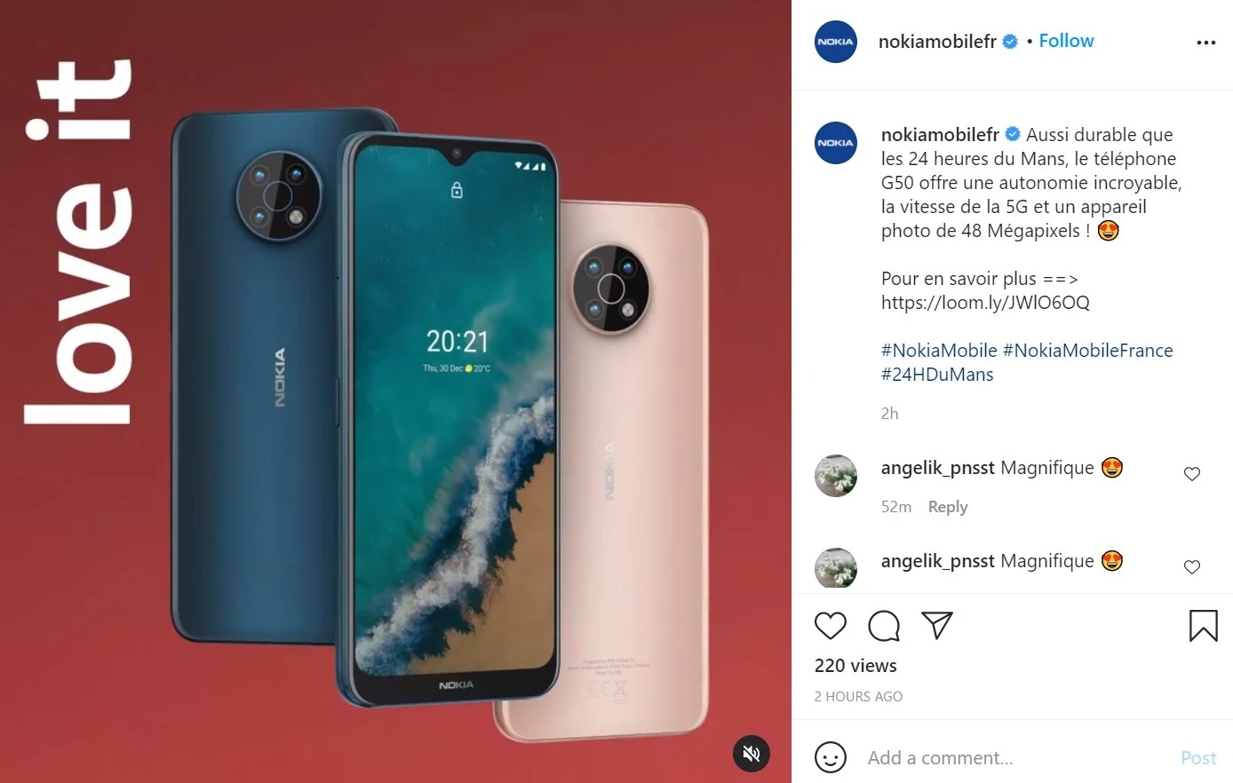 HMD Global đang chuẩn bị ra mắt một mẫu smartphone mới mang thương hiệu Nokia, có tên gọi đầy đủ là Nokia G50. Mới đây, chiếc điện thoại này vừa vô tình xuất hiện trong một video quảng cáo chính thức được chia sẻ bởi tài khoản Instagram của Nokia Mobile tại Pháp. Hiện tại, bài đăng đã bị xoá bỏ, tuy nhiên một số người dùng đã nhanh chóng chụp lại và chia sẻ lại đoạn clip lên mạng xã hội.