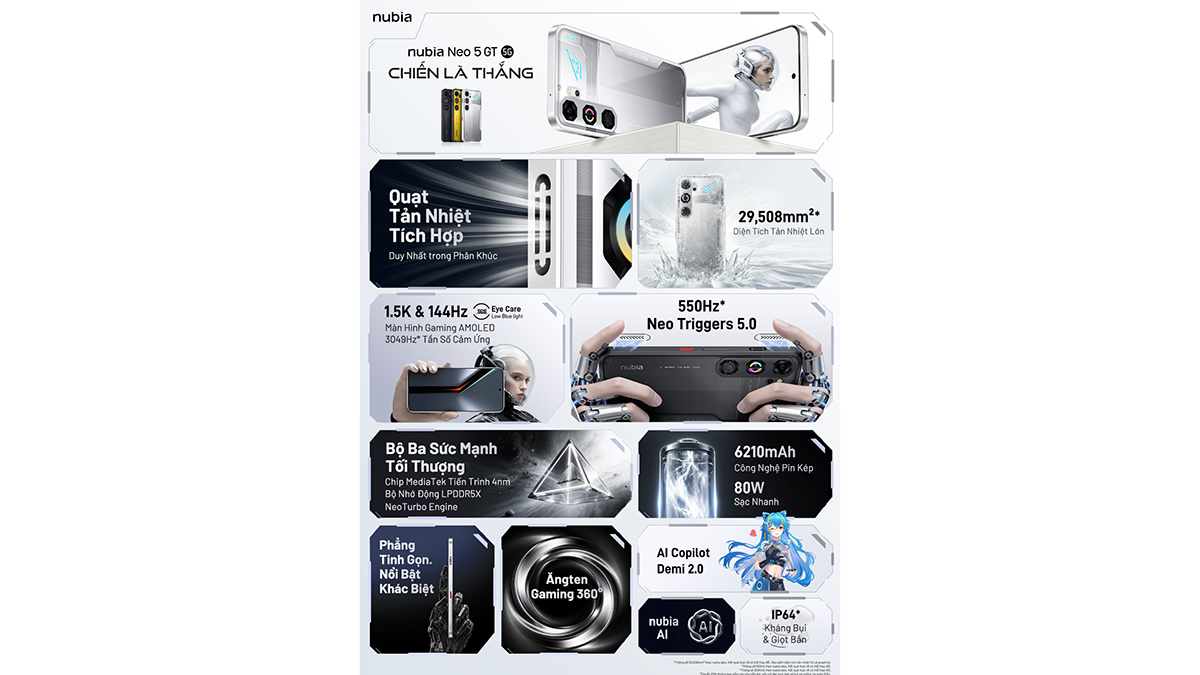 nubia NEO 5 GT là phiên bản gaming phone hiệu năng cao trong dòng NEO 5, được tạo ra cho thế hệ người dùng trẻ theo đuổi những trận đấu mang tính cạnh tranh cao, nơi từng mili giây phản hồi, từng độ ổn định khung hình và từng chi tiết thiết kế đều có ý nghĩa quyết định.