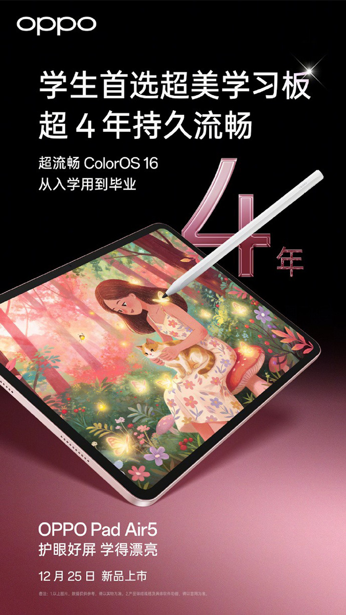 Ngoài ra, Pad Air 5 sẽ chạy ColorOS 16 và được OPPO cam kết mang lại trải nghiệm mượt mà lên đến 4 năm. Hãng định vị tablet này là một thiết bị có thể đồng hành cùng người dùng từ lúc nhập học cho tới khi tốt nghiệp mà không gặp tình trạng chậm chạp đáng kể.