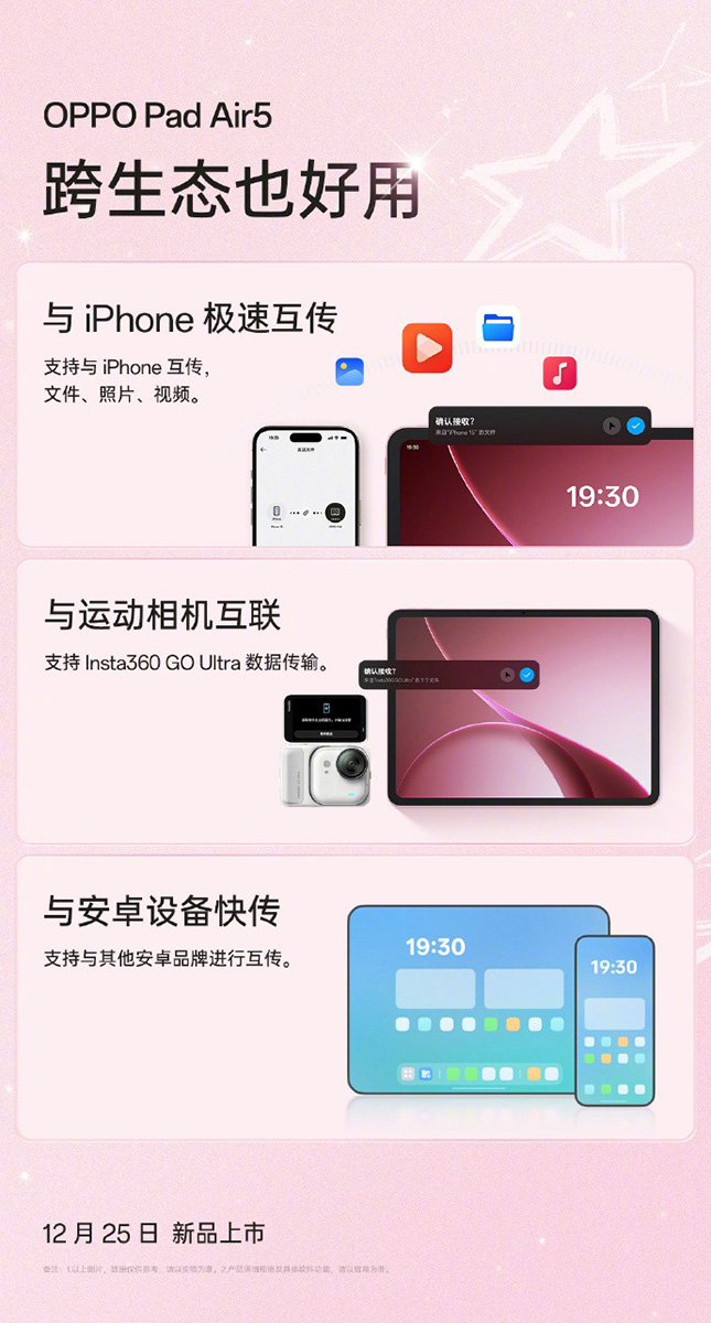 Máy tính bảng sắp ra mắt của OPPO cũng hỗ trợ truyền file nhanh với iPhone, chuyển dữ liệu từ camera Insta360 Go Ultra, cũng như chia sẻ file với các thiết bị Android khác. Thiết bị có pin 10,050 mAh với hỗ trợ sạc nhanh 33W SuperCharge. Theo OPPO, viên pin này đủ đáp ứng nhu cầu học trực tuyến cường độ cao, với khả năng phục vụ tối đa 15 buổi học online liên tiếp chỉ với một lần sạc.