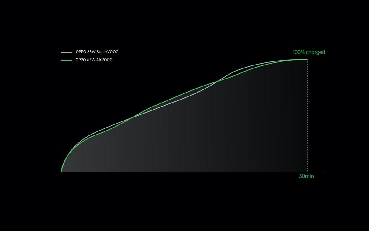 Sạc nhanh không dây AirVOOC 65W có thể sạc đầy pin 4.000mAh trong nhanh nhất là 30 phút. Công nghệ giảm thiểu việc nhiễu tần số và qua đó cho phép sạc không dây được áp dụng rộng rãi.