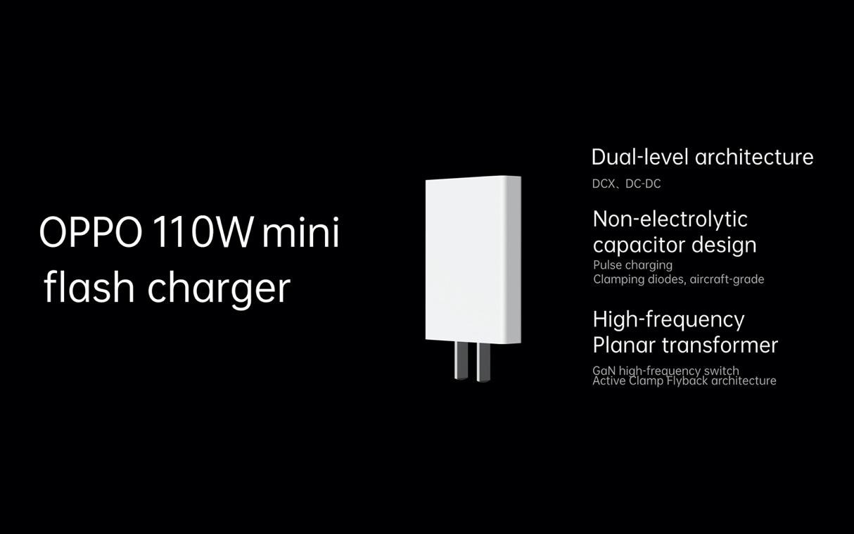 Được phát triển dựa trên sạc nhanh mini SuperVOOC 50W, sạc nhanh mini 110W của OPPO đã loại bỏ những hạn chế về kích thước cũng như tăng cường hiệu quả sạc của các củ sạc dòng cao. Bên cạnh việc sử dụng kiến trúc 2 lớp tiên tiến để đạt được hiệu năng chuyển đổi nguồn và kiểm soát nhiệt độ, sạc nhanh mini 110W còn được xây dựng dựa trên sự kết hợp giữa kính phiến và cấu trúc nhỏ gọn giúp giảm kích thước của thiết bị xuống chỉ còn 35.76 cm – tương đương với một củ sạc 18W thông thường.