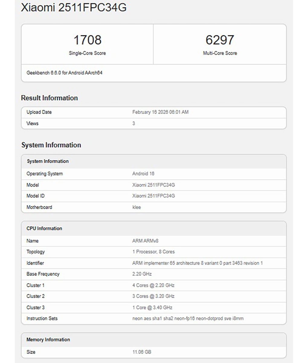 Cụ thể, POCO X8 Pro xuất hiện trên Geekbench với số model 2511FPC34G. Tại đây, điện thoại thông minh này được xác nhận dùng chip Dimensity 8500 của MediaTek, đi kèm RAM 12GB và chạy trên hệ điều hành Android 16.