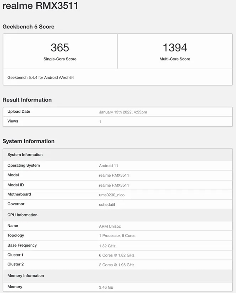 Realme C35 xuất hiện trên Geekbench với vi xử lý UNISOC và 4GB RAM