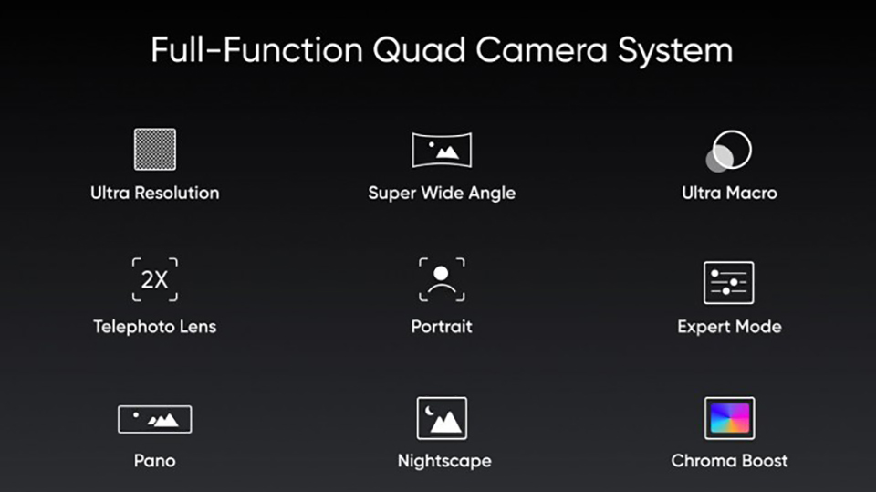 Ngoài ra, trong 3 điện thoại có 4 camera mà Realme đang phát triển thì nhiều khả năng người kế nhiệm của Realme X sẽ sử dụng cảm biến chính 64MP, trong khi 2 model còn lại sẽ sử dụng camera 48MP của Samsung. Dù chưa tiết lộ thông số kỹ thuật chi tiết của các ống kính nhưng Realme đã đăng tải một hình ảnh cho thấy các điện thoại này sẽ sử dụng ống kính góc siêu rộng, tele, macro và có các chế độ chụp ảnh như chân dung, panorama, chuyên gia, và tăng cường Chroma.
