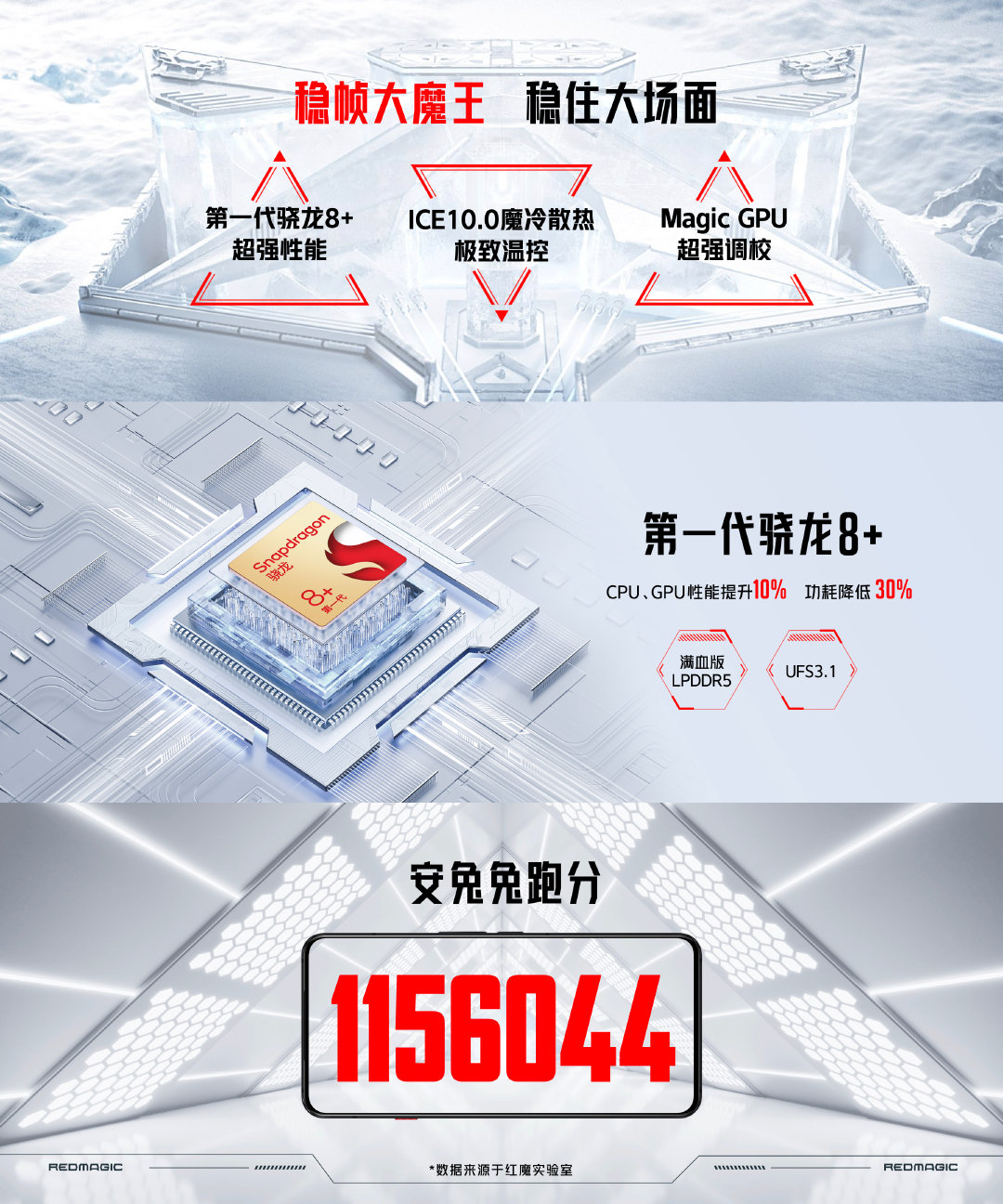Về cấu hình, thiết bị sử dụng bộ vi xử lý Snapdragon 8+ Gen 1 đi kèm với đó là 12GB/16GB RAM và 256GB/512GB bộ nhớ trong. Chiếc máy được trang bị hệ thống tản nhiệt ICE 10.0 tiên tiến hơn. Khi bán ra điện thoại được cài đặt sẵn giao diện người dùng RedMagic OS 5.5 trên nền hệ điều hành Android 12.