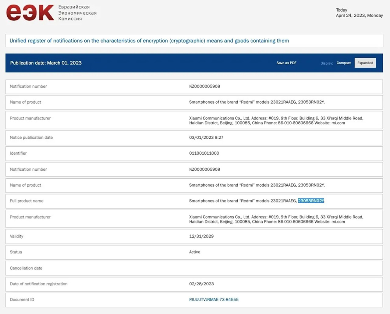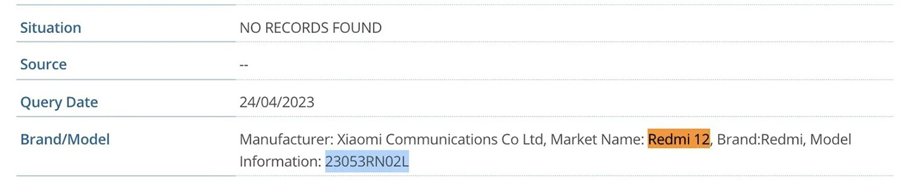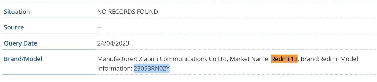 Theo rò rỉ hôm nay, Redmi 12 có thể ra mắt ở nhiều thị trường khác nhau với mức giá hấp dẫn. Thiết bị đã xuất hiện trên các trang web FCC và IMEI trước khi ra mắt. Danh sách trên IMEI xác nhận số model và tên của điện thoại. Cụ thể, Redmi 12 có số model là 23053RN02L. Một biến thể khác của điện thoại có số model 23053RN02Y đã được phát hiện trên trang web của FCC.