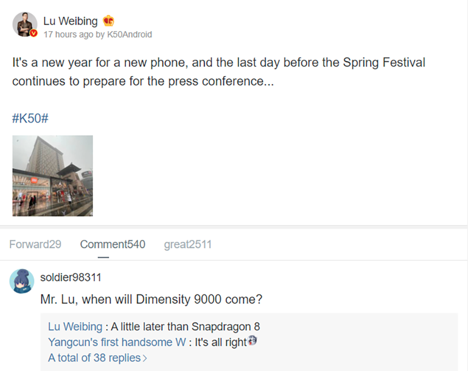 Cụ thể, Tổng giám đốc thương hiệu Redmi - Lu Weibing đã lên Weibo để giới thiệu về cuộc họp báo sắp tới, tại đó công ty chuẩn bị ra mắt dòng thiết bị cao cấp tiếp theo của mình. Dưới bài đăng trên blog của mình, một người dùng Weibo đã hỏi khi nào công ty sẽ phát hành biến thể Dimensity 9000 của dòng Redmi K50 và Lu Weibing trả lời rằng nó sẽ được phát hành 'chậm hơn một chút so với Snapdragon 8.' Một rò rỉ gần đây đã tiết lộ rằng Redmi K50 Gaming Edition sẽ đi kèm với chipset Snapdragon 8 Gen 1 trong khi Redmi K50 Pro+ sẽ có SoC MediaTek Dimensity 9000.Vì vậy, có vẻ như Redmi K50 Gaming Edition sẽ thực sự ra mắt trước Redmi K50 Pro+. Và theo một rò rỉ trước đó, thiết bị thậm chí có thể là điện thoại đầu tiên được phát hành trong dòng sản phẩm K50.