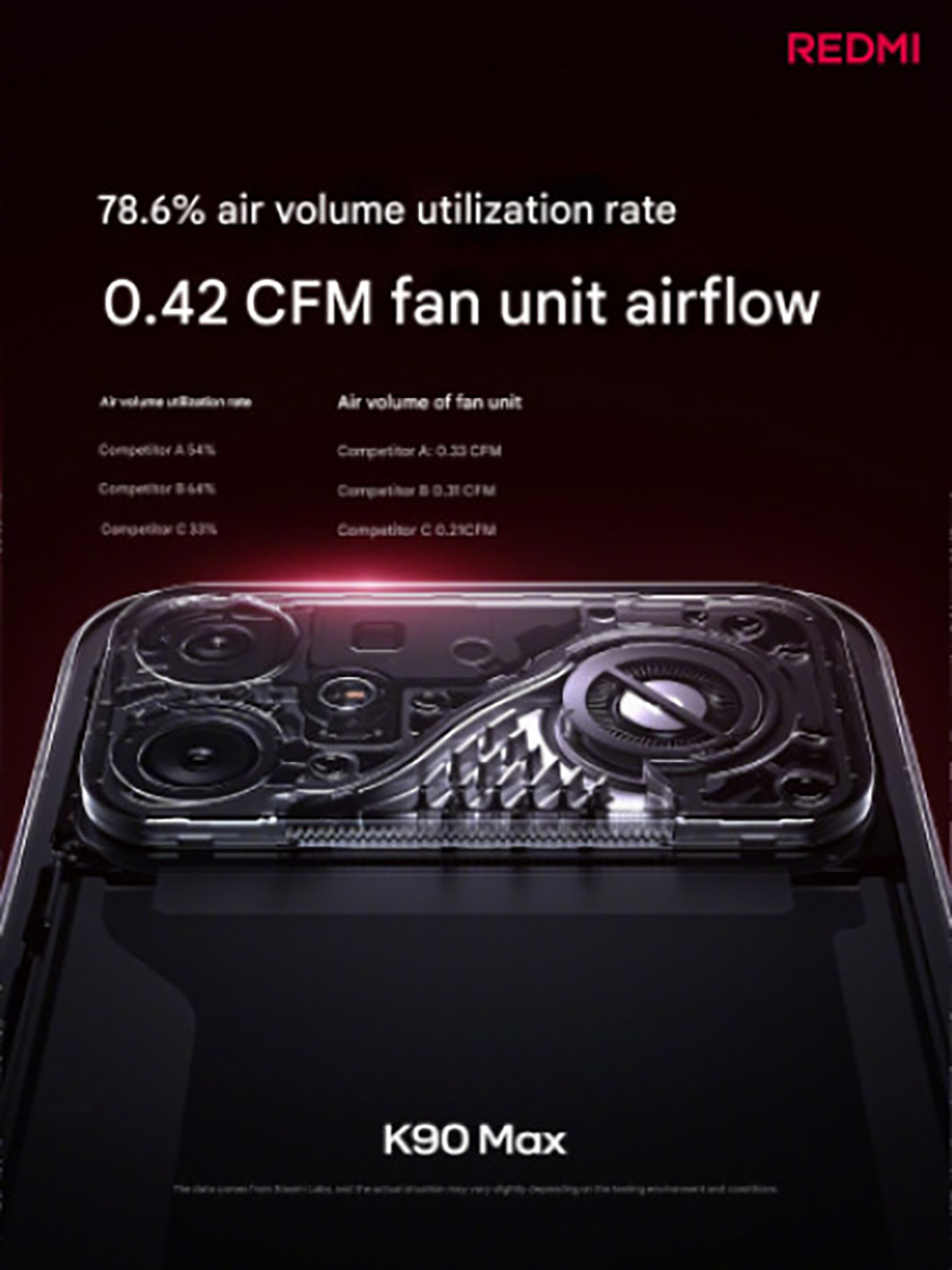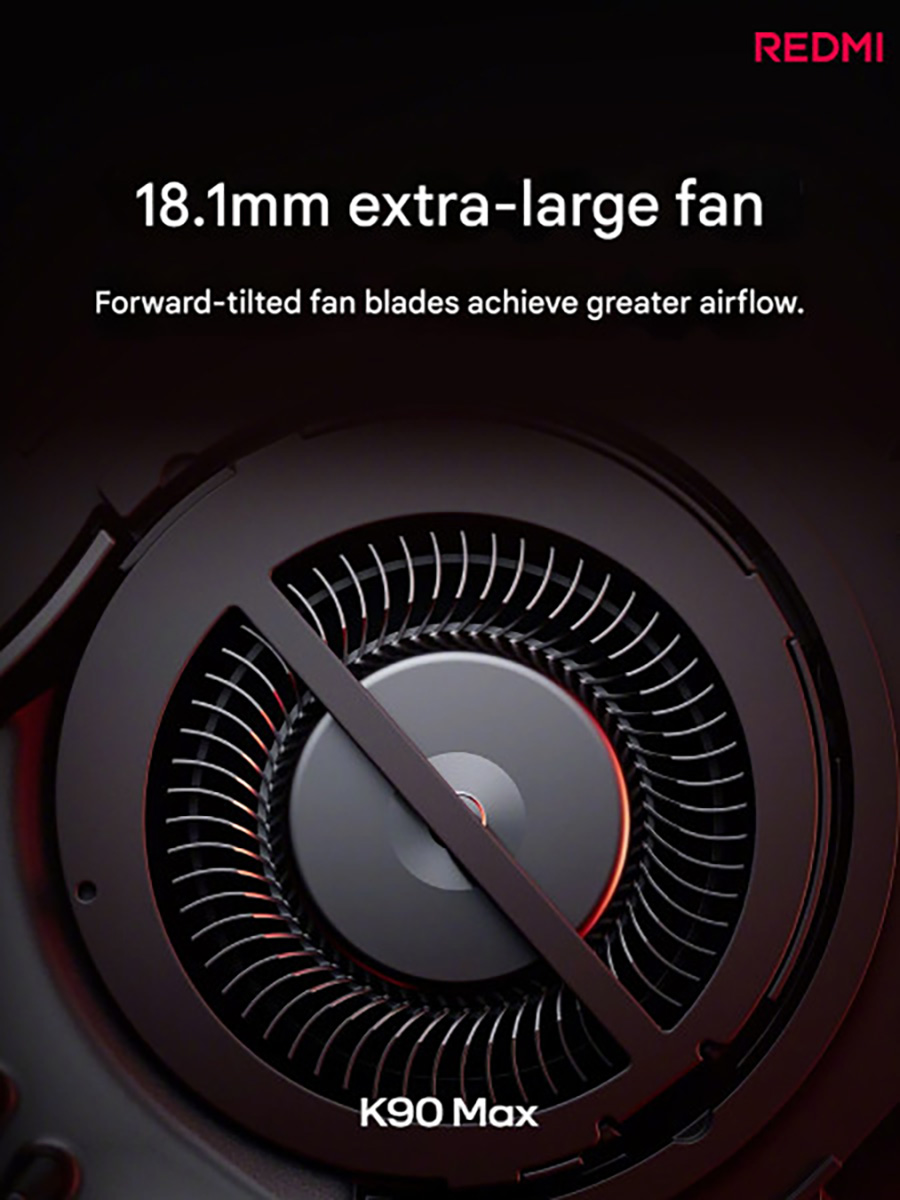 Cụ thể, Redmi K90 Max sở hữu quạt tản nhiệt với đường kính 18.1mm, mà Xiaomi cho biết là lớn hơn hầu hết các đối thủ cùng phân khúc. Nó sử dụng cửa hút gió thẳng đứng với các cánh quạt nghiêng về phía trước để đẩy luồng không khí hiệu quả hơn, cùng với ống dẫn khí kín và thiết kế luồng khí kiểu xoáy nhằm giảm nhiễu loạn.