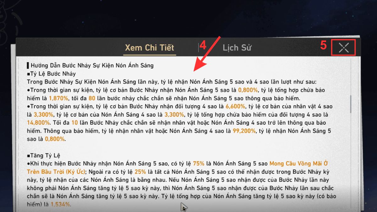 - Bước 4: Đọc kỹ tỉ lệ xuất hiện của các vật phẩm > Nhấn X để trở lại banner.