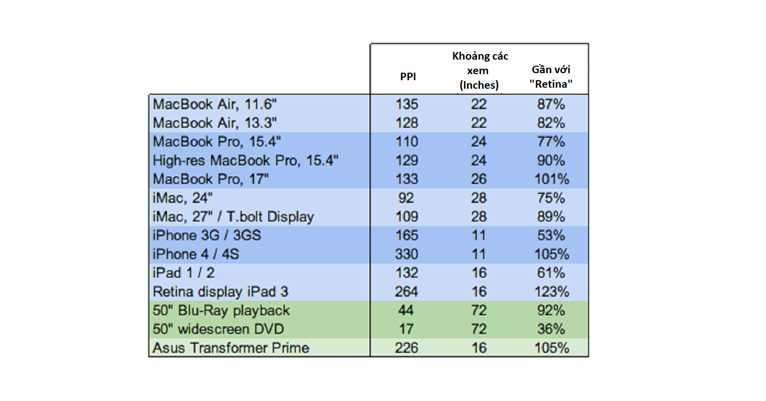 Vì khoảng cách xem ở mỗi thiết bị là khác nhau (bạn cầm điện thoại gần mặt hơn so với máy tính bảng) nên số lượng pixel trên mỗi inch (PPI) được sử dụng để đạt được chất lượng Retina là khác nhau.