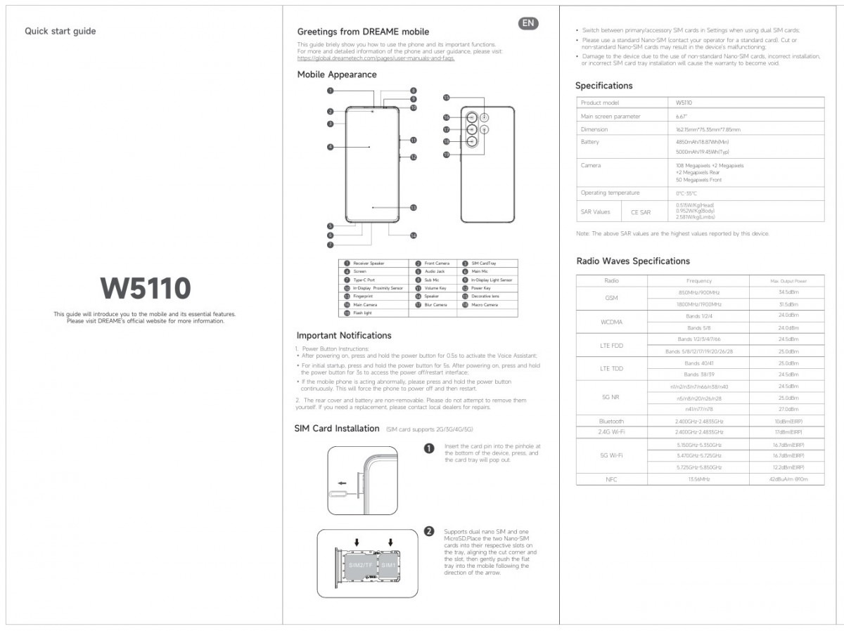 Cụ thể, smartphone Dreame E1 với số hiệu model W5110 vừa được tìm thấy trong cơ sở dữ liệu EPREL. Hơn nữa, sách hướng dẫn sử dụng của nó cũng đã được tìm thấy trực tuyến, và nhờ đó mà chúng ta có được những thông tin cấu hình của máy.