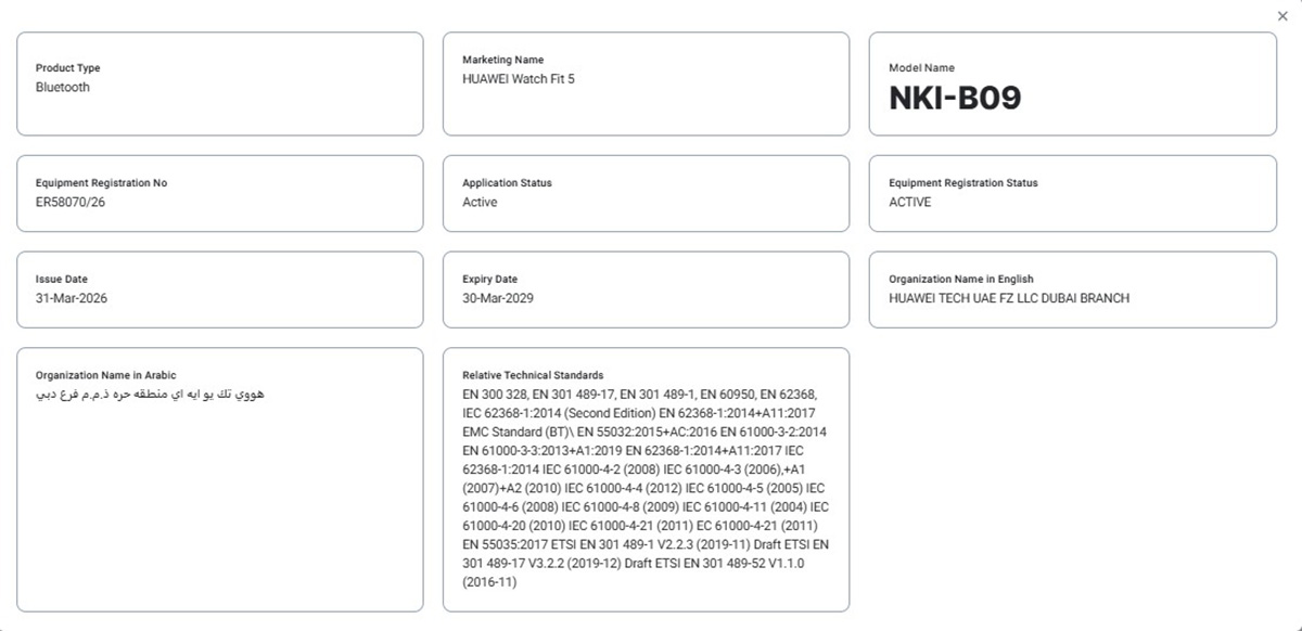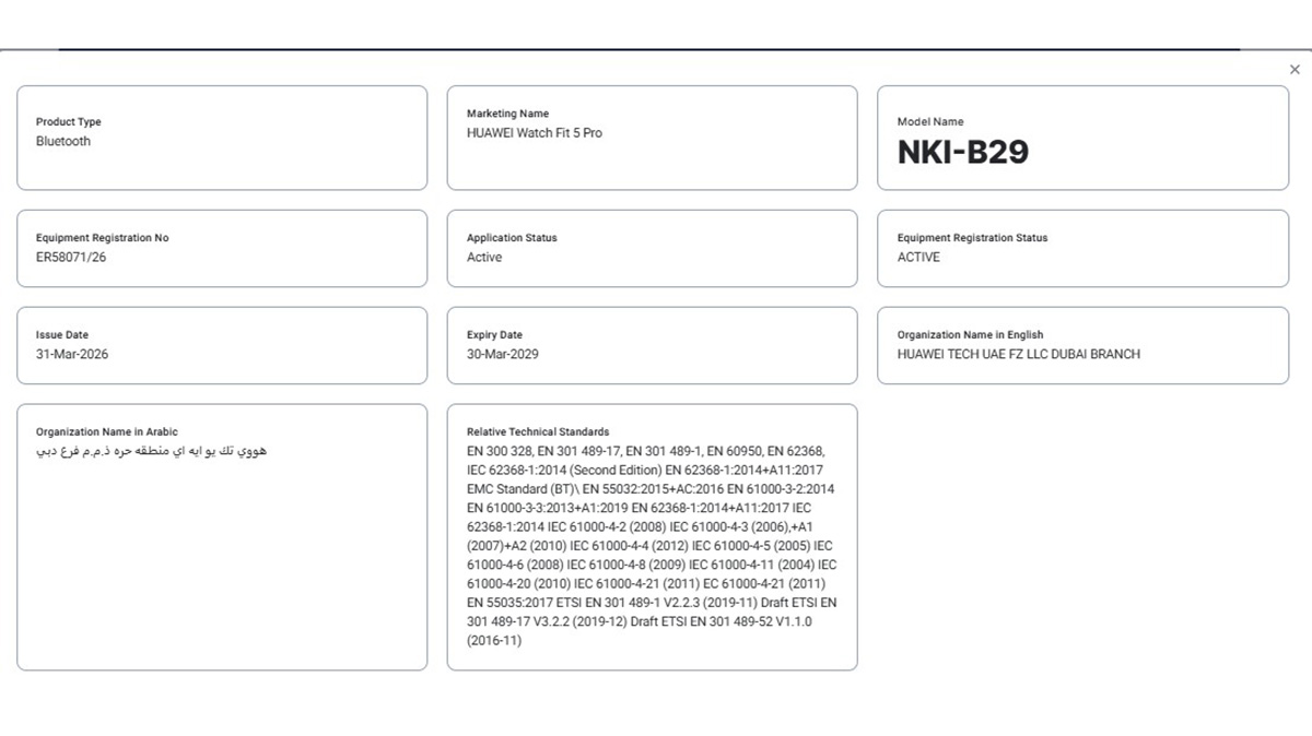 Bắt đầu với chứng nhận TDRA, Huawei Watch Fit 5 được liệt kê với số model là “NKI-B09”, trong khi Watch Fit 5 Pro mang số model là “NKI-B29”. Cả hai thiết bị này đều đã nhận được phê duyệt chứng nhận vào ngày 31/3/2026, với số đăng ký thiết bị tương ứng là “ER58070/26” và “ER58071/26”. Ngoài ra, chúng đều được phân loại là thiết bị hỗ trợ Bluetooth.