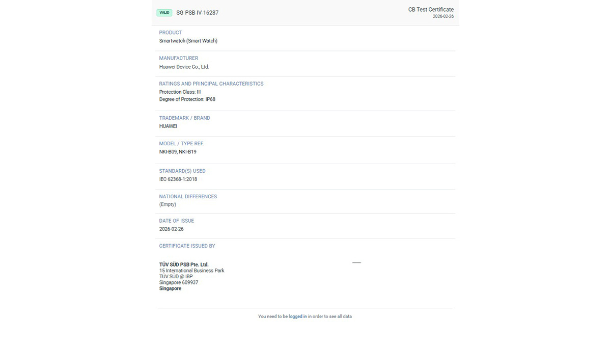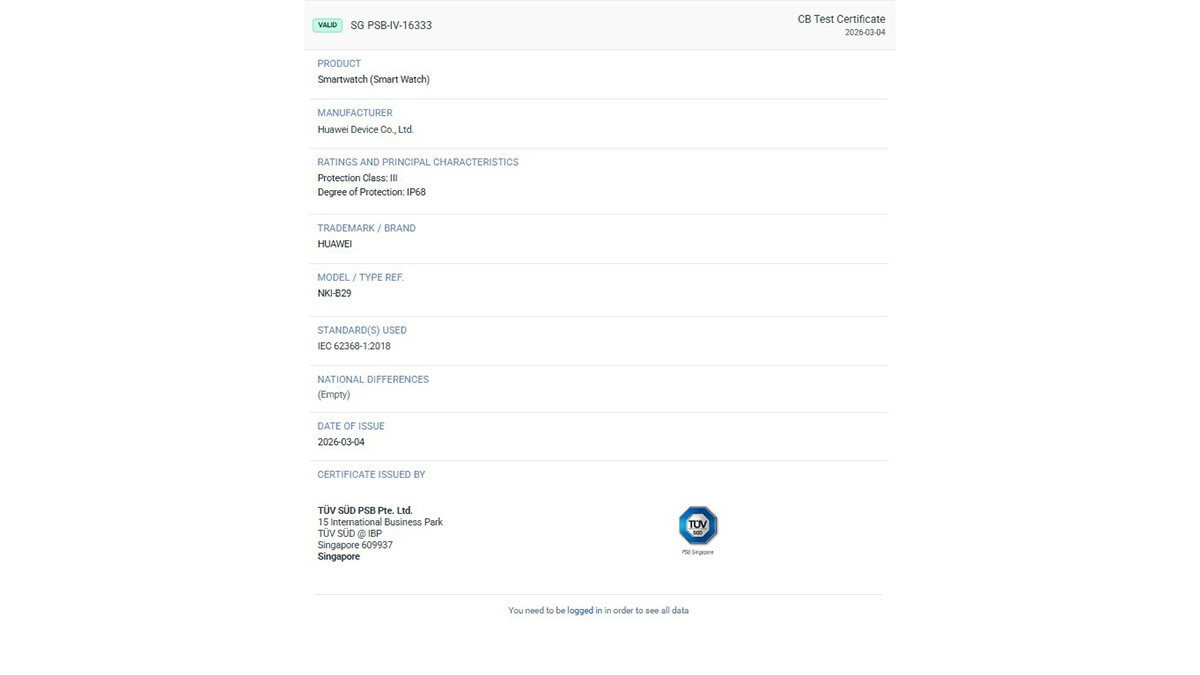 Về chứng nhận TUV, các số hiệu model “NKI-B09” và “NKI-B29” được đề cập ở trên đã được liệt kê trong hai mục chứng nhận riêng biệt, và cả hai thiết bị đều được phân loại là đồng hồ thông minh. Theo xếp hạng và các đặc điểm chính, cả Watch Fit 5 và Watch Fit 5 Pro đều được chứng nhận đạt chuẩn IP68, cho thấy khả năng kháng nước, chống bụi ấn tượng.