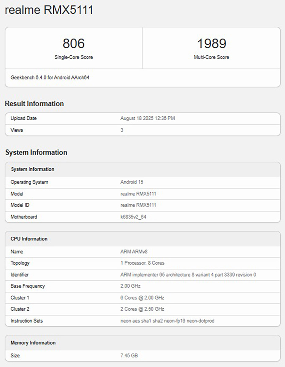 Ngoài thông tin bộ xử lý, danh sách Geekbench còn tiết lộ realme 15T sẽ có RAM 8GB và chạy trên hệ điều hành Android 15. Trong các bài kiểm tra lõi đơn và đa lõi, thiết bị đạt lần lượt 806 và 1,989 điểm.
