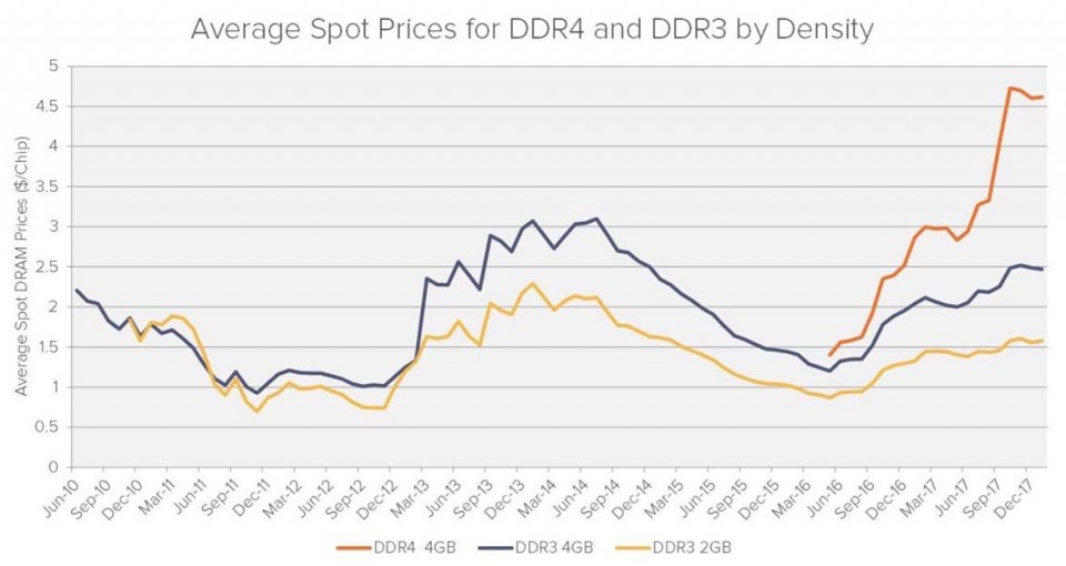 Nhìn chung, giá DRAM đã tăng 47% trong năm 2017, đây là mức tăng lớn nhất trong vòng 30 năm qua.