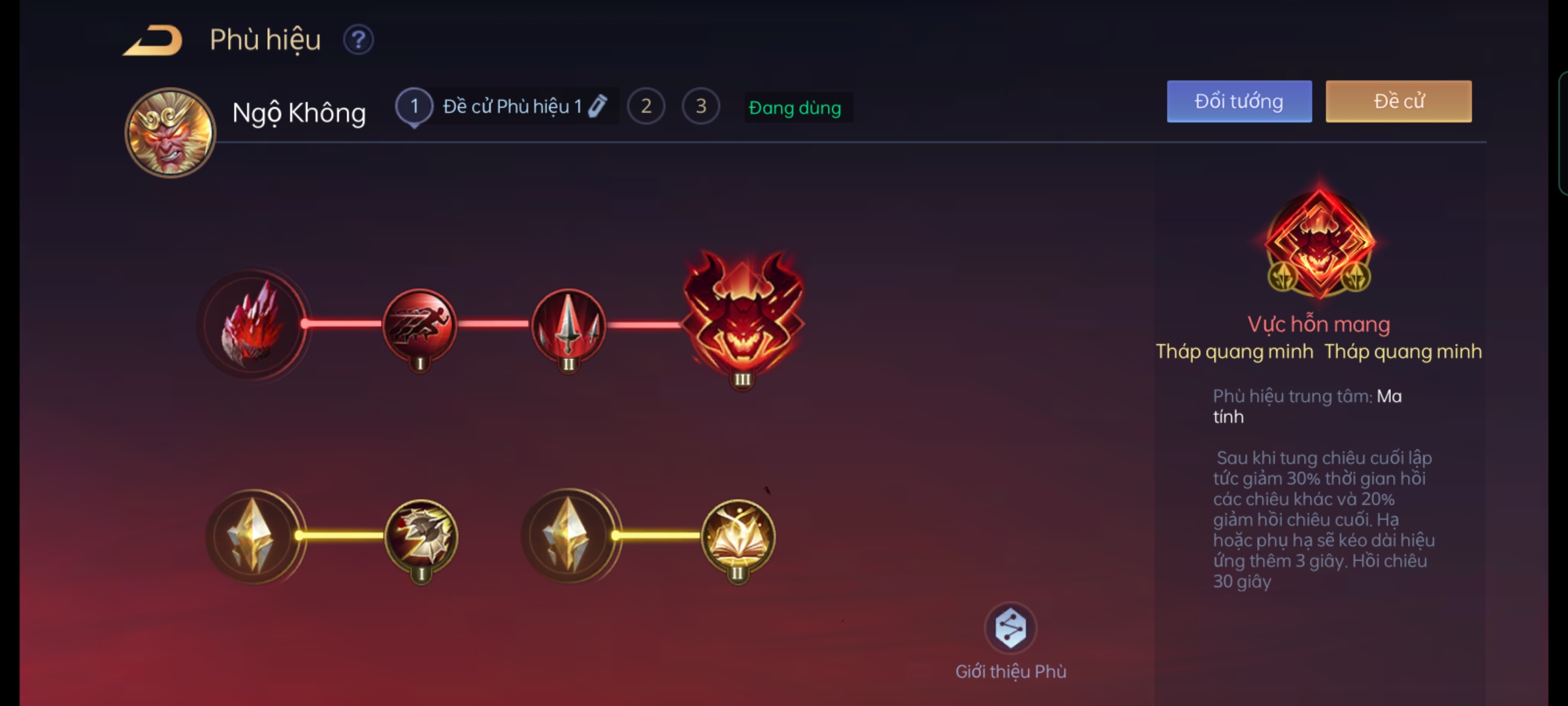 Phù Hiệu này sẽ giúp cho Ngộ Không gây thêm sát thương và có thể dồn sát thương nhiều hơn. Khi sử dụng phù hiệu Ma Tính sẽ được giảm mạnh thời gian hồi chiêu, lúc này Ngộ Không sẽ có thêm một lần combo nữa khiến cho kẻ địch bốc hơi nhanh chóng.
