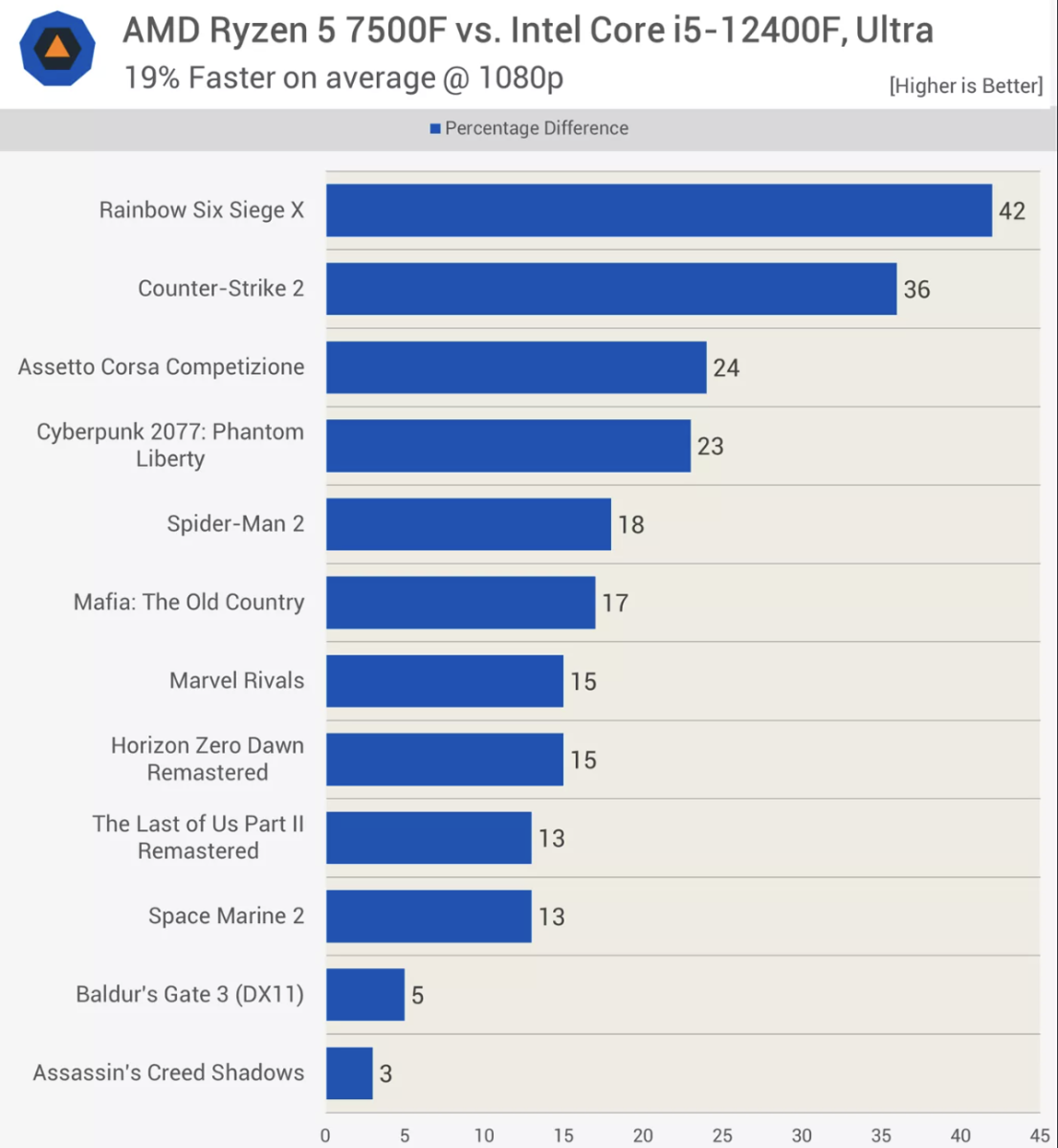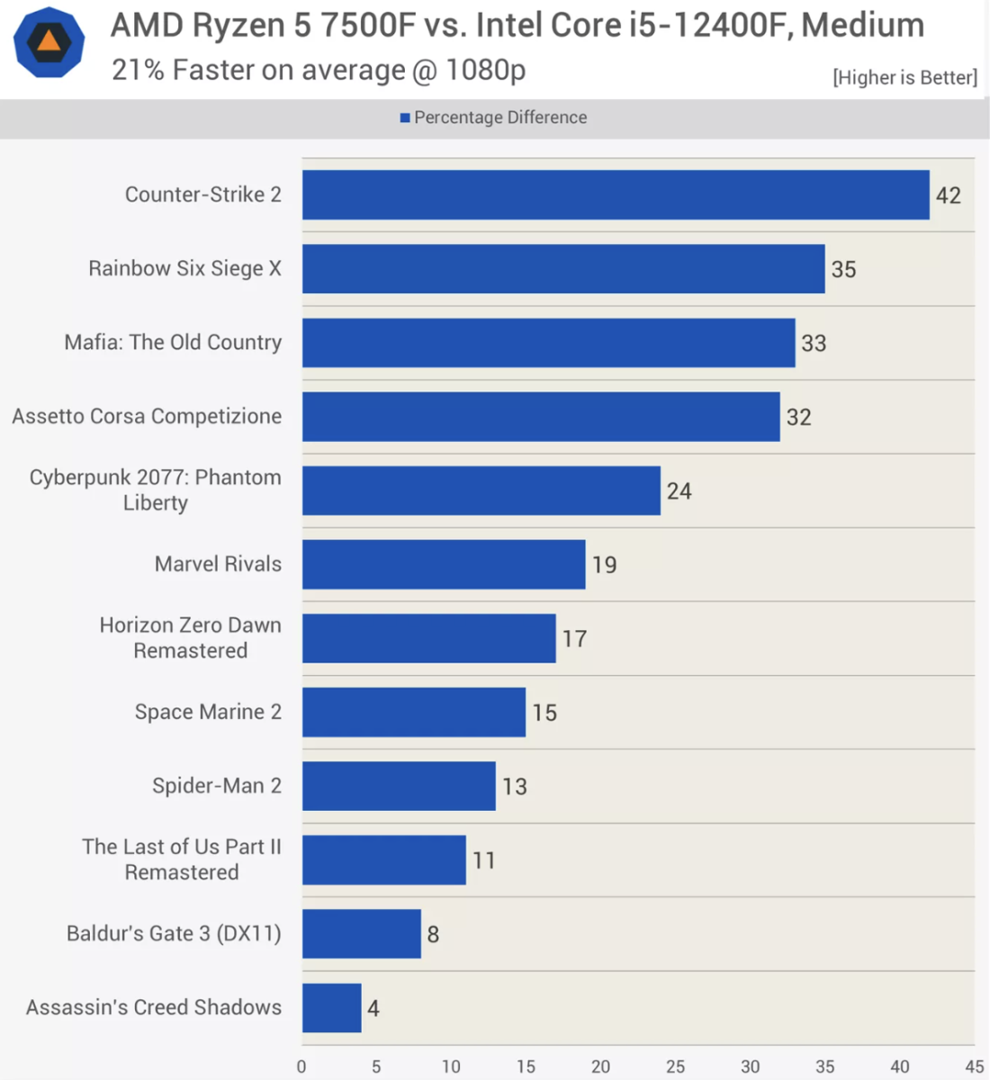 Các trò chơi khác như Spider-Man 2, Mafia: The Old Country hay Marvel Rivals vẫn giữ mức chênh từ 13–18%, tức Ryzen 5 7500F luôn duy trì ưu thế ổn định trên đa số tựa game. Chỉ có Baldur’s Gate 3 và Assassin’s Creed Shadows là rơi vào mức chênh rất thấp (3–5%), chủ yếu vì bị giới hạn bởi GPU nên kết quả gần như cân bằng.