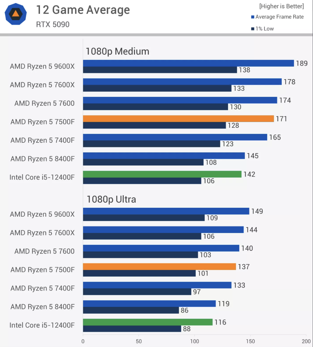 Tổng hợp cả 12 tựa game, có thể thấy 7500F không chỉ mạnh hơn trong điều kiện lý tưởng mà còn giữ ưu thế nhất quán ở mọi mức thiết lập, củng cố vị thế là lựa chọn vượt trội cho những ai ưu tiên hiệu năng chơi game lâu dài.