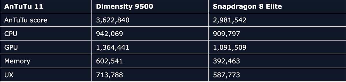 Thử nghiệm hiệu năng trên phần mềm AnTuTu Benchmark V11 cho thấy, chip của MediaTek vượt trội đối thủ với tổng điểm cao hơn khoảng 22% so với Snapdragon 8 Elite.