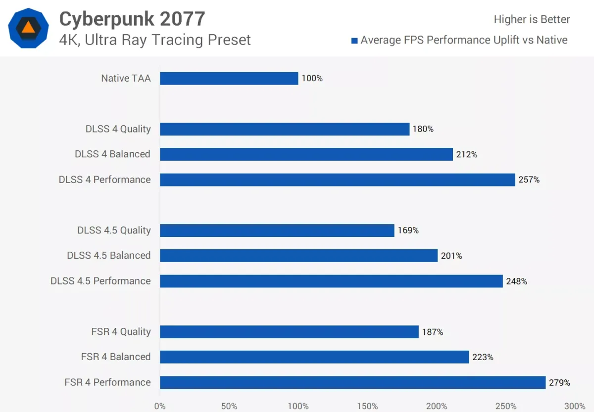 Trong Cyberpunk 2077 với thiết lập dò tia cao nhất, ở chế độ 4K ưu tiên hiệu năng, DLSS 4 nhanh hơn bản gốc 157%, DLSS 4.5 nhanh hơn 128%, còn FSR 4 đạt mức tăng 179%. Ở 1440p, FSR 4 cũng mang lại mức cải thiện gần tương đương DLSS 4.