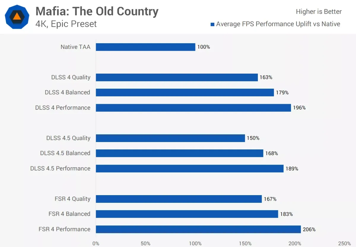 Sang Mafia: The Old Country, DLSS 4 chế độ ưu tiên chất lượng tăng 63% hiệu năng so với bản gốc, DLSS 4.5 tăng 50%, trong khi FSR 4 đạt 67% ở 4K. Với 1440p, FSR 4 thậm chí còn nhỉnh hơn nhẹ trên RX 9070 XT so với DLSS 4 trên RTX 5070 Ti.