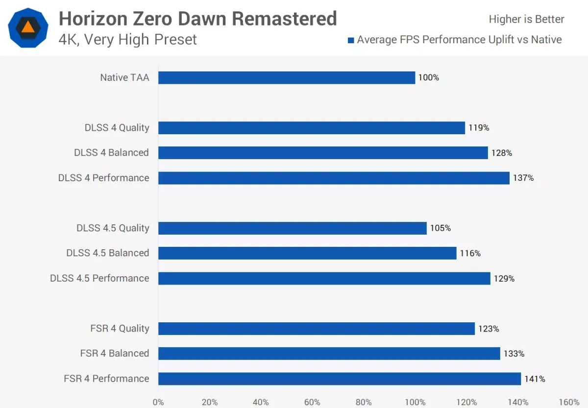 Kết quả ở Horizon Zero Dawn Remastered cũng tương tự: FSR 4 nhìn chung ngang DLSS 4, còn DLSS 4.5 thường chậm hơn khoảng nửa đến một “bậc” so với FSR 4. Trong một số trường hợp xấu nhất, DLSS 4.5 ở chế độ ưu tiên hiệu năng có thể chỉ ngang với FSR 4 ở chế độ cân bằng.