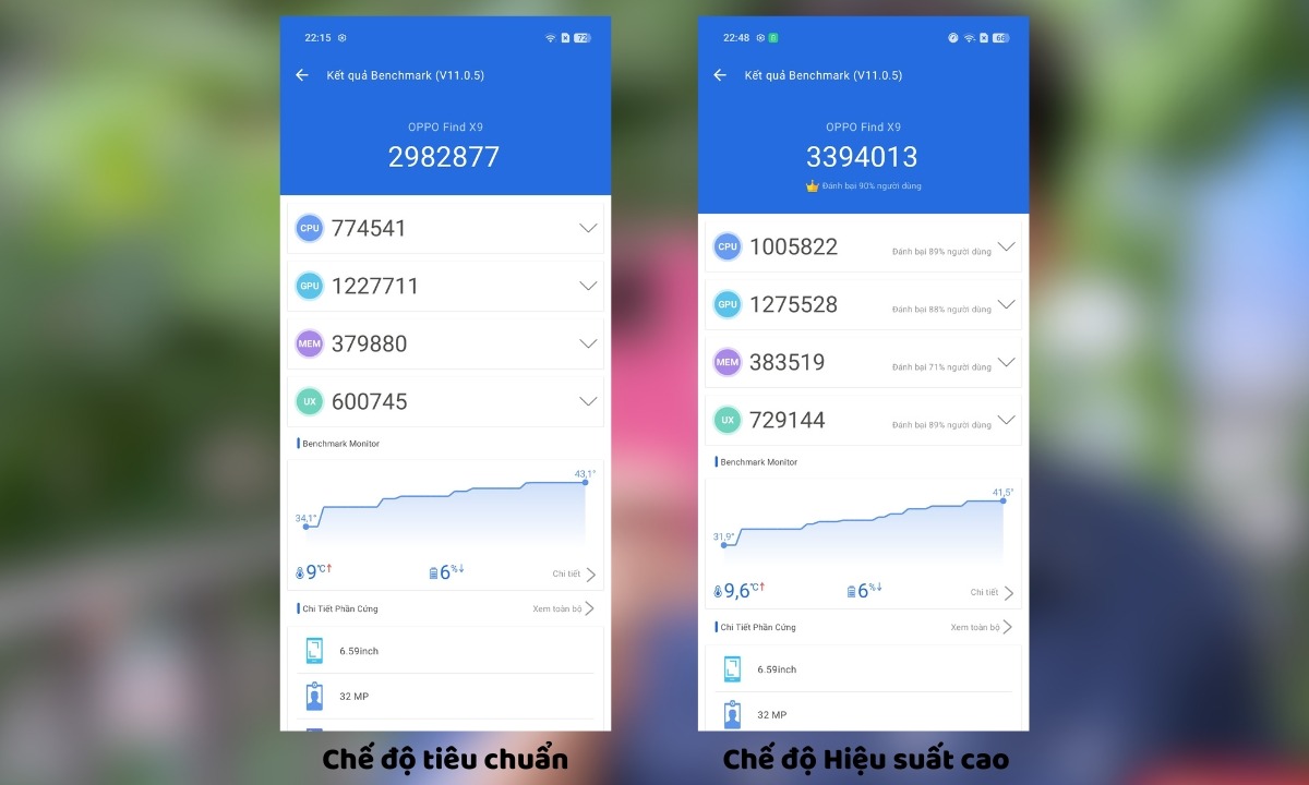Trong khi đó, OPPO Find X9 ở chế độ hiệu suất cao đạt tới 3.3 triệu điểm AnTuTu. Tuy nhiên, điểm số Geekbench của máy lại thấp hơn một chút so với đối thủ Samsung là 3,094 trong bài kiểm tra hiệu năng đơn nhân và 8,867 điểm trong bài test hiệu năng đa nhân.