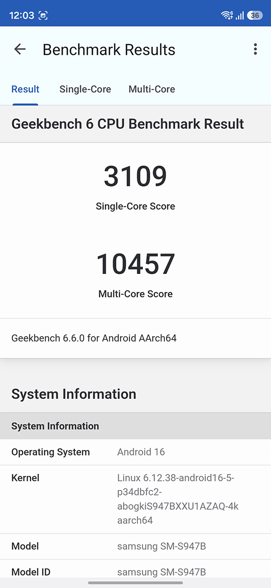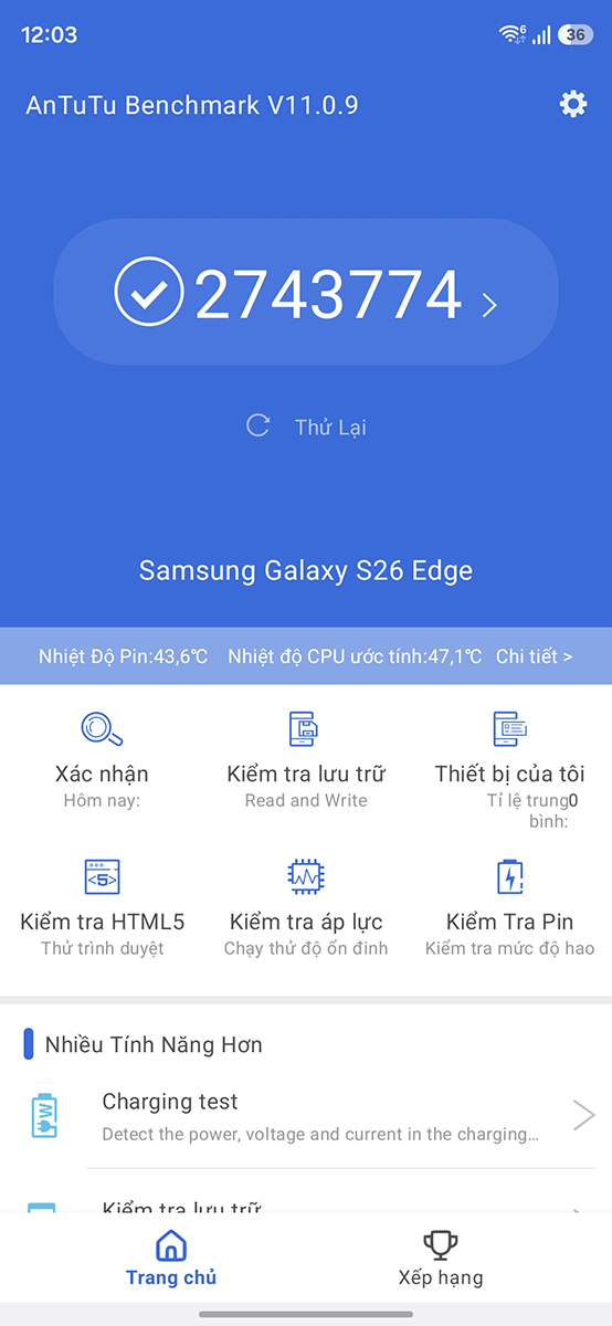 Thử chấm điểm trên các phần mềm benchmark, Galaxy S26 Plus đạt hơn 2.7 triệu điểm AnTuTu và lần lượt 3,109/10,457 trong các bài kiểm tra hiệu năng đơn/đa nhân trên phần mềm Geekbench 6.
