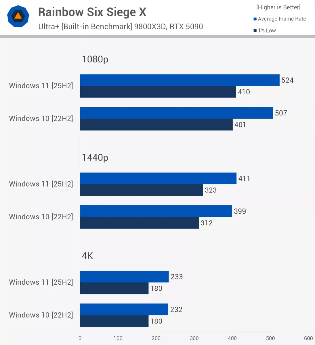 Ở Rainbow Six Siege X, chênh lệch hiệu năng giữa Windows 10 và Windows 11 25H2 là rất nhỏ. Windows 11 chỉ nhỉnh hơn khoảng 3% tại cả 1080p và 1440p, trong khi ở 4K thì hiệu năng gần như giống hệt nhau khi bắt đầu giới hạn bởi GPU. Điều này cho thấy với các tựa game eSports hoặc tối ưu tốt, khác biệt giữa hai hệ điều hành gần như không đáng kể trong trải nghiệm thực tế.