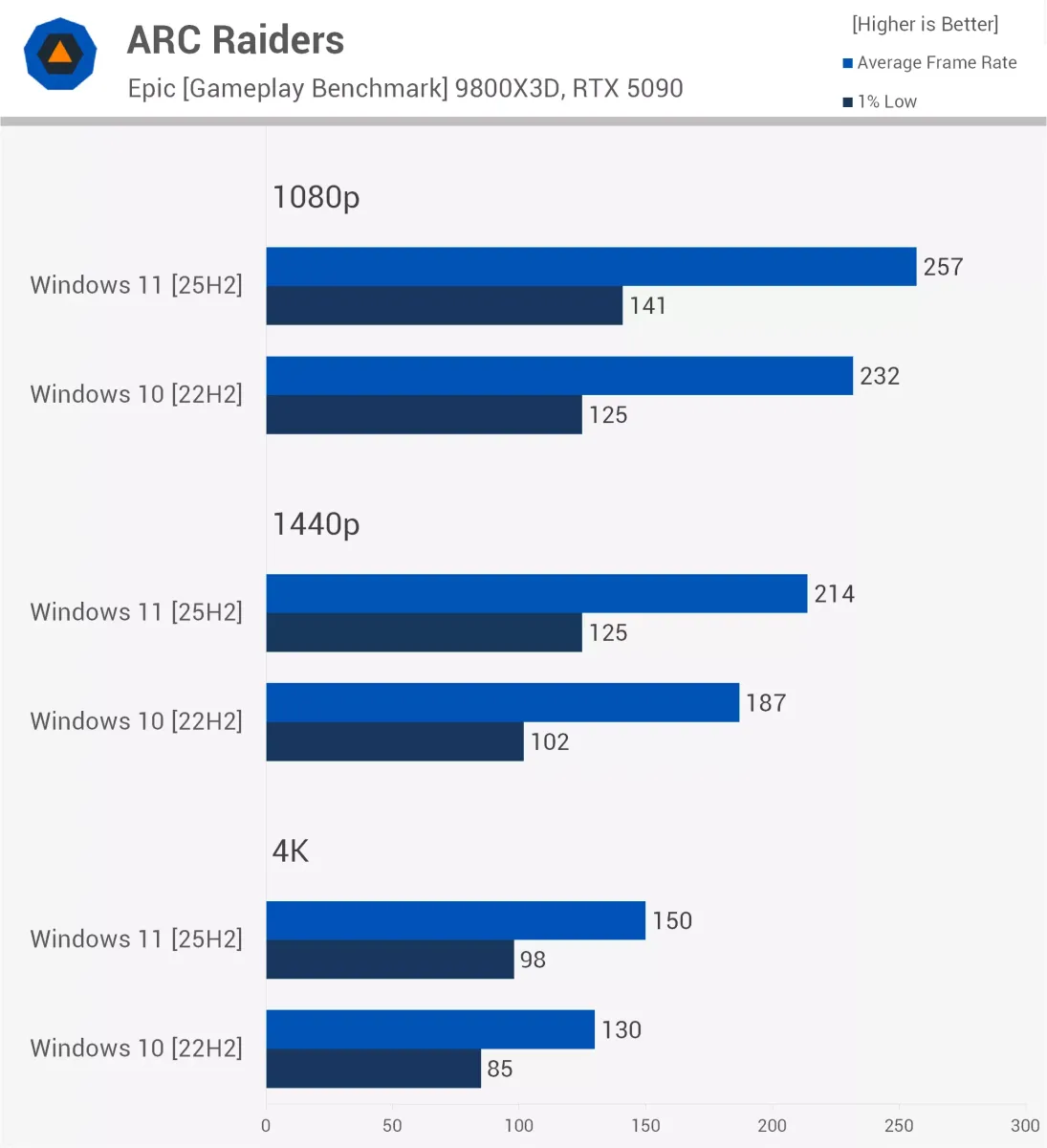 Một trong những kết quả đáng chú ý nhất đến từ Arc Raiders, khi Windows 11 nhanh hơn tới 11% ở 1080p, 14% ở 1440p và 15% ở 4K. Đáng nói hơn, khoảng cách còn tăng khi lên độ phân giải cao, điều vốn khá bất ngờ trong các bài test gaming. Đây cũng là trường hợp hiếm hoi mà Windows 11 tạo ra lợi thế rõ rệt và dễ nhận thấy hơn so với Windows 10.