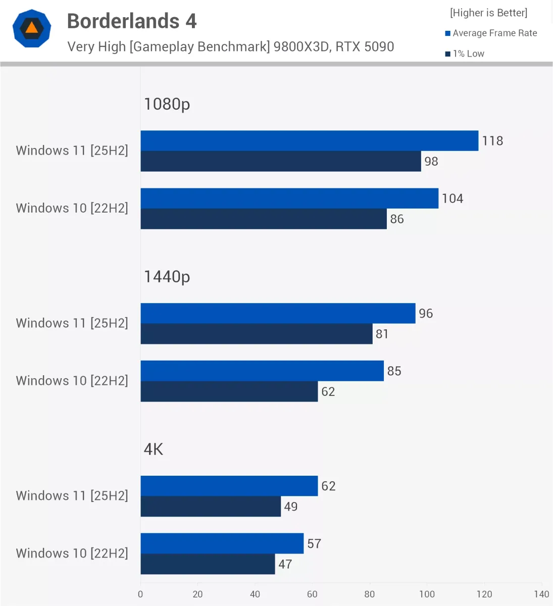Xu hướng này cũng xuất hiện ở Borderlands 4, nơi Windows 11 cho hiệu năng cao hơn khoảng 13% ở cả 1080p và 1440p, và vẫn duy trì mức hơn 9% ngay cả ở 4K. Đây là một ví dụ rõ ràng cho thấy Windows 11 có thể mang lại lợi thế trong một số tựa game AAA mới, đặc biệt khi hệ thống vẫn còn bị giới hạn bởi CPU thay vì GPU.