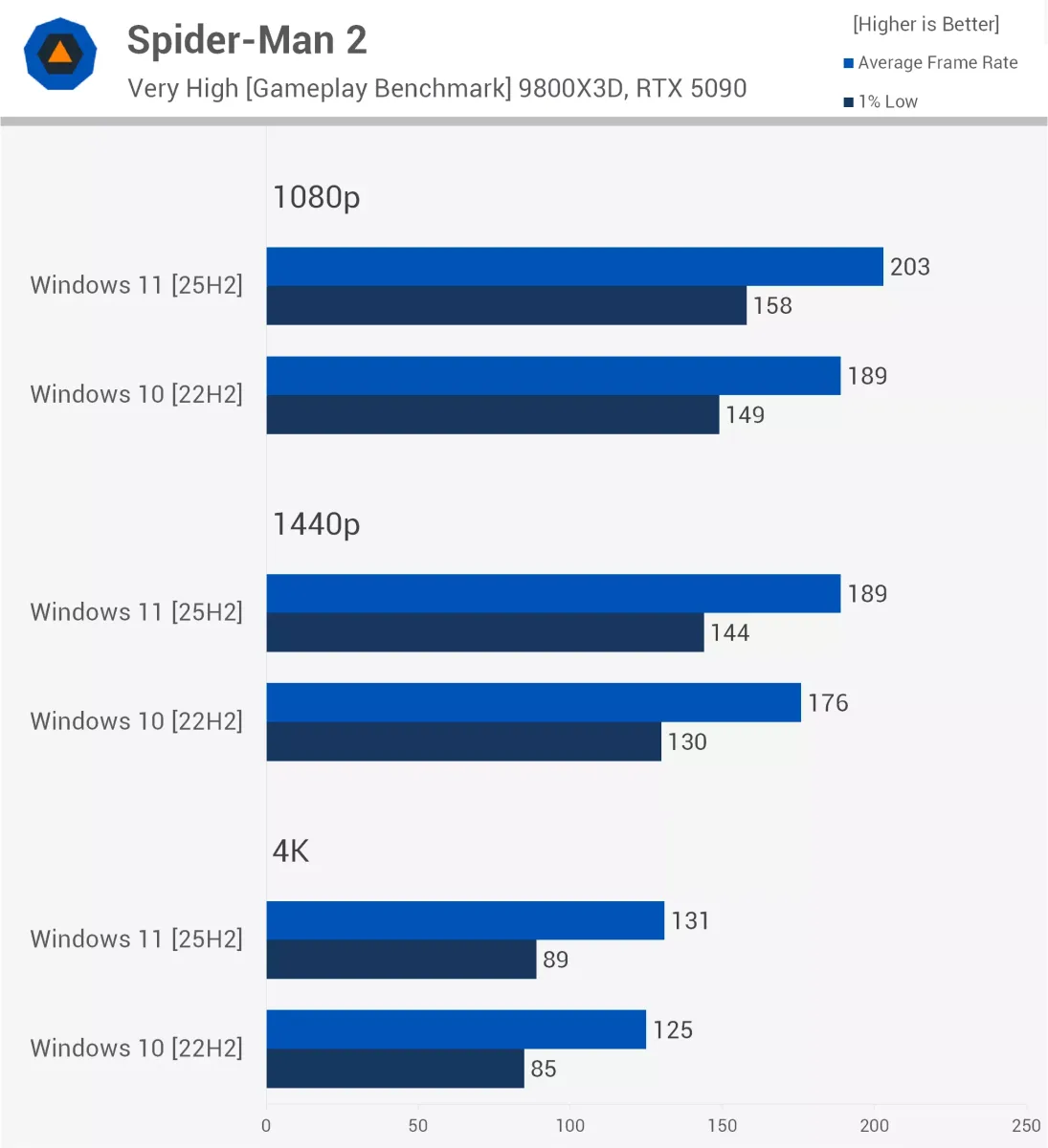 Tuy vậy, phần lớn khác biệt này cũng có thể đến từ yếu tố driver GPU, giống như trường hợp Spider-Man 2 cho thấy kết quả thay đổi rõ rệt khi chuyển sang Radeon RX 9070 XT. Điều đó cho thấy hiệu năng không chỉ phụ thuộc vào hệ điều hành mà còn bị tác động bởi phần cứng và mức độ tối ưu của từng tựa game. Nhìn chung, với một danh sách game đủ lớn, khoảng cách hiệu năng giữa Windows 11 25H2 và Windows 10 vẫn khá nhỏ và khó tạo khác biệt rõ rệt nếu chỉ chơi game thông thường.