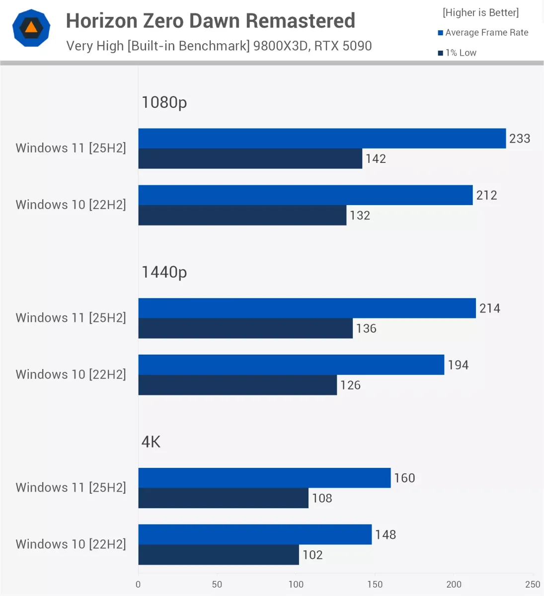 Ở Horizon Zero Dawn Remastered, Windows 11 cho thấy lợi thế rõ rệt với mức nhanh hơn 10% tại 1080p và 1440p, đồng thời vẫn hơn khoảng 8% ở 4K. Khi test lại với Ryzen 7 9700X, chênh lệch gần như tương tự với Windows 11 nhanh hơn 9% ở 1080p/1440p và 7% ở 4K, cho thấy kết quả này khá nhất quán ngay cả khi thay đổi CPU.