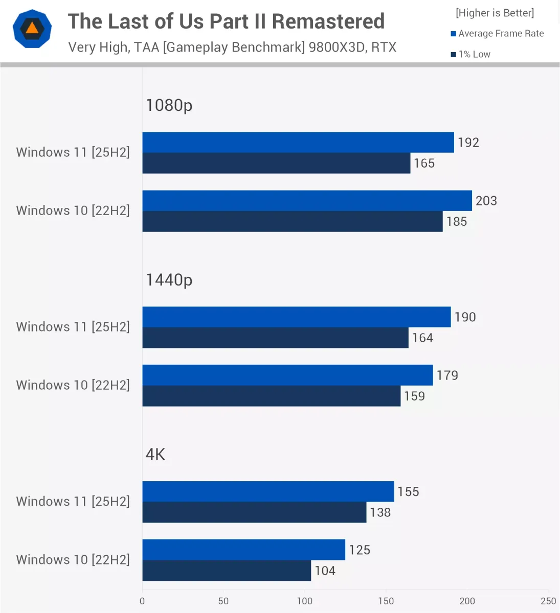The Last of Us Part II Remastered là trường hợp khó lý giải nhất trong bài test. Ở 1080p, Windows 10 nhanh hơn khoảng 6% và vượt tới 12% ở chỉ số 1% lows, nhưng tại 1440p thì Windows 11 lại nhỉnh hơn 6%. Đáng chú ý nhất là ở 4K, Windows 11 tăng vọt lên mức trung bình 155 fps, trong khi Windows 10 chỉ đạt 125 fps, tương đương chênh lệch khoảng 24%. Đây là kết quả gây nhiều bất ngờ vì mức dao động quá lớn giữa các độ phân giải.