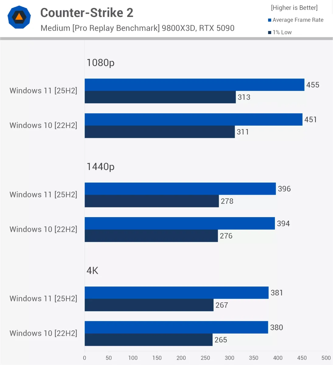 Cuối cùng, Counter-Strike 2 là ví dụ điển hình cho thấy hai hệ điều hành gần như không tạo khác biệt. Sai số hiệu năng giữa Windows 10 và Windows 11 chỉ dưới 1%, đồng nghĩa trải nghiệm chơi game thực tế hoàn toàn tương đương và khó có thể nhận ra sự chênh lệch khi chơi bình thường.