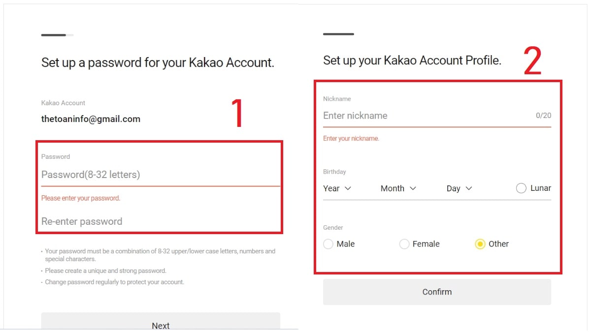 Bước 4: Thiết lập mật khẩu và các thông tin cá nhân quan trọng (tên, ngày sinh, giới tính, …) đồng ý với các điều khoản.