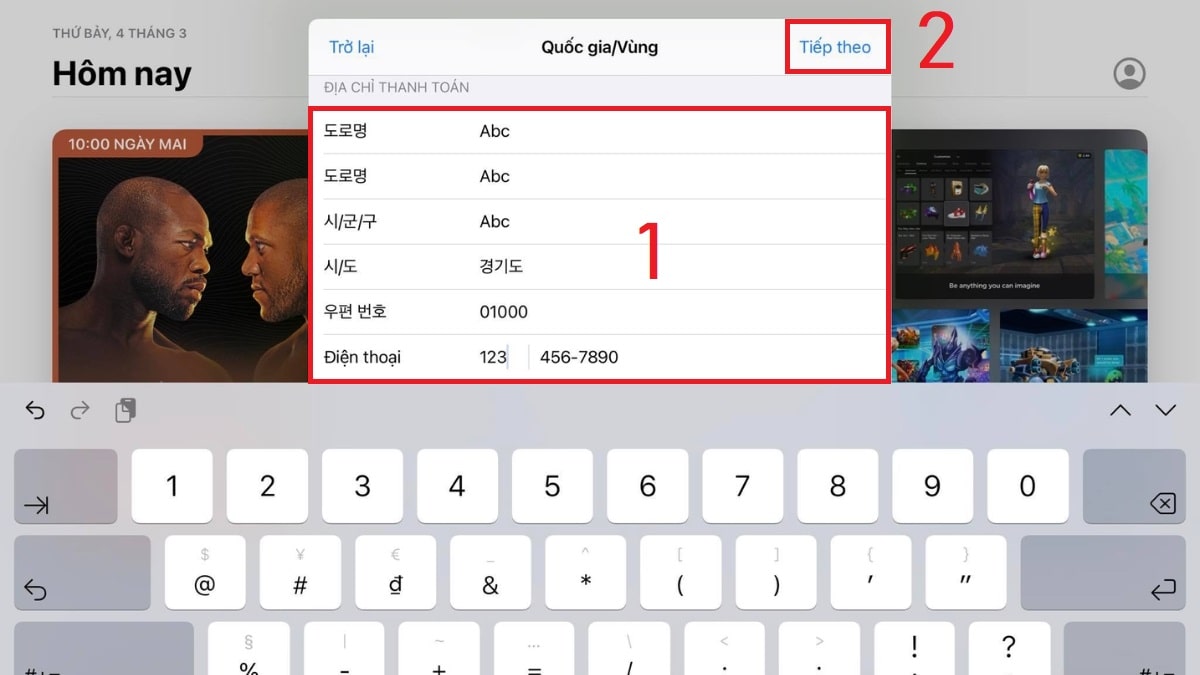 Bước 4: Điền các thông tin cần thiết gồm quốc gia, postcode và số điện thoại (điền như trên hình) nhấp chọn “Next” để lưu lại.