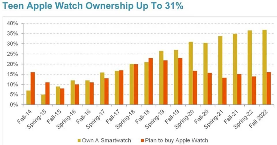 Apple Watch ít phổ biến hơn, với chỉ 31% thanh thiếu niên sở hữu thiết bị đeo tay của Apple. Tuy nhiên, Apple Watch cho đến nay vẫn là đồng hồ thông minh phổ biến nhất đối với thanh thiếu niên. 36.8% thanh thiếu niên cho biết sở hữu đồng hồ thông minh, vì vậy chỉ 5.8% sở hữu đồng hồ thông minh không phải là Apple Watch.