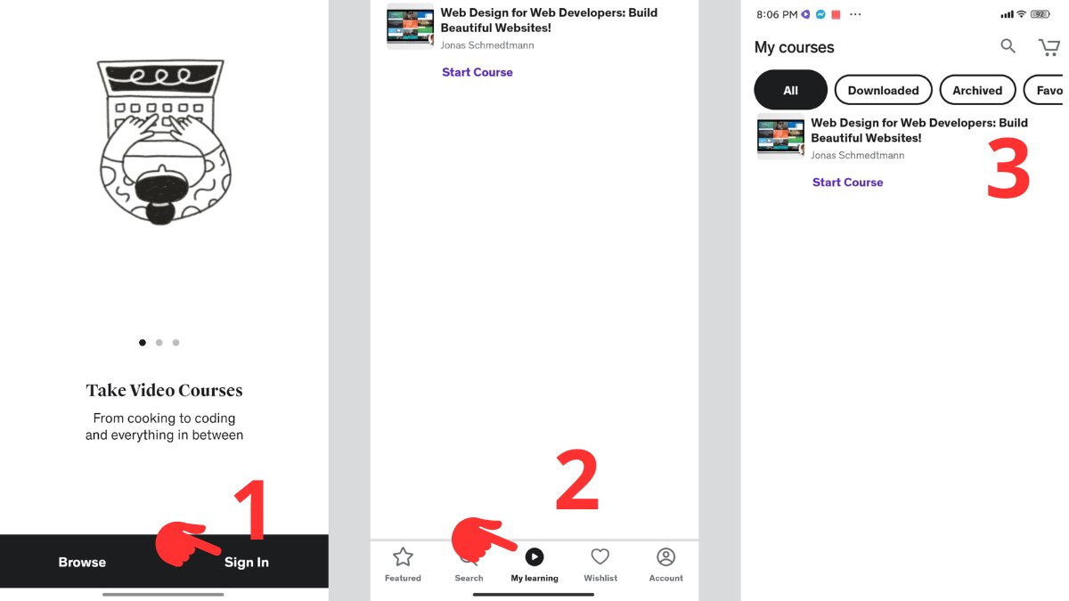 Bước 2: Mở ứng dụng Udemy lên, đăng nhập vào tài khoản của bạn truy cập vào “My Learning” tìm khóa học đã mua mà bạn muốn tải về.