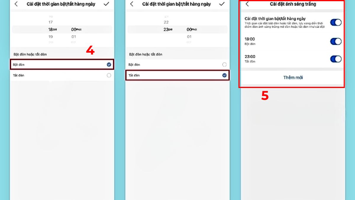 - Tại màn hình cài đặt ánh sáng trắng, bạn lần lượt chọn khung giờ bật đèn (ví dụ 18:00 → Bật đèn) và khung giờ tắt đèn (ví dụ 23:00 → Tắt đèn).