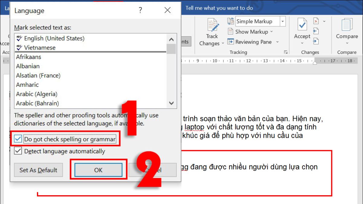 Bước 4: Sau khi bỏ đánh dấu, bạn hãy nhấn vào OK để hoàn tất. Bạn sẽ không còn thấy văn bản hiển thị dấu gạch chân đỏ sữa lỗi chính tả, ngữ pháp.
