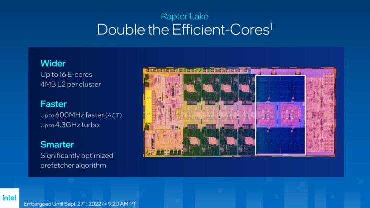 CPU Raptor Lake thế hệ thứ 13 của Intel sẽ sử dụng thiết kế lõi lai, có sự kết hợp giữa P-Core được tối ưu hóa hiệu suất và E-Core được tối ưu hóa hiệu quả năng lượng. Intel sử dụng một P-Core hoàn toàn mới được gọi là Raptor Cove sẽ thay thế các lõi Golden Cove có trên các CPU Alder Lake. Đối với The E-Core, Intel sẽ giữ lại kiến trúc lõi Gracemont hiện có nhưng nó sẽ đi kèm với những cải tiến nhỏ.