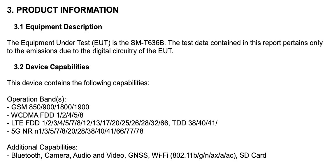 Samsung Galaxy Tab Active 4 Pro LTE có mã là SM-T636B. Thiết bị hỗ trợ rất nhiều băng tần LTE và 5G trong đó có một vài băng tần phổ thông như là n41, n77 và n78. Phiên bản Wi-Fi sẽ có mã là SM-T630.