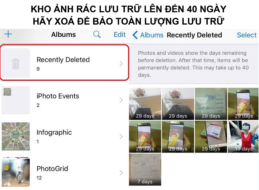 Một trong những thứ ngốn bộ nhớ trên iPhone nhất đó là ảnh và video trong thùng rác. Những thứ này sẽ làm cho chiếc điện thoại bạn trở nên chật chội hơn. Khi bạn xoá một bức ảnh hay một cái video bất kỳ thì chúng sẽ mặc định được chuyển vào trong hộp thoại thùng rác trong ứng dụng Ảnh, mà thời gian chờ để xoá vĩnh viễn những bức ảnh lên đến 40 ngày.