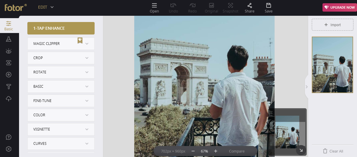 Không chỉ hỗ trợ rất nhiều tính năng của một trình sửa ảnh thông dụng, Fotor phiên bản web còn cóOne-Tap Enhance. Với tính năng 'godlike' này, bạn không cần phải đắn đo suy nghĩ phải chỉnh ảnh như thế nào cả, chỉ cần chạm một phát thôi là những bức hình sẽ được tự động chỉnh một cách ảo diệu.
