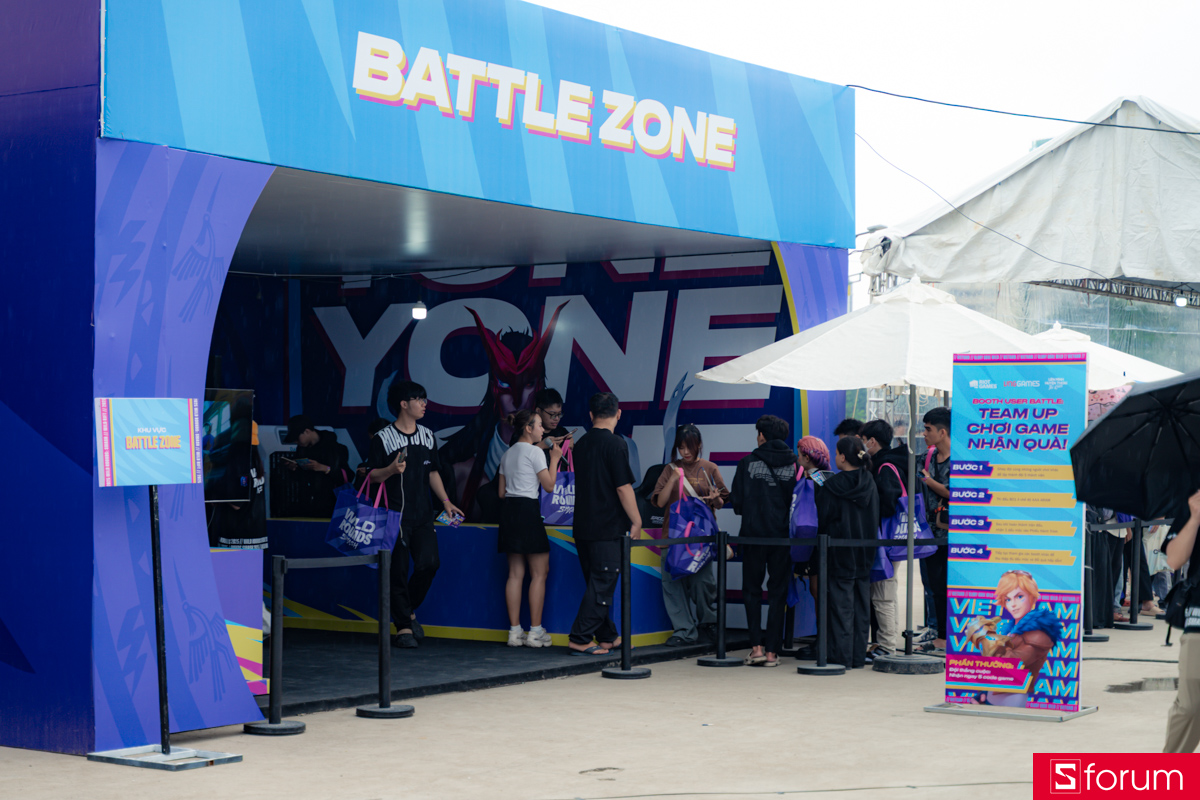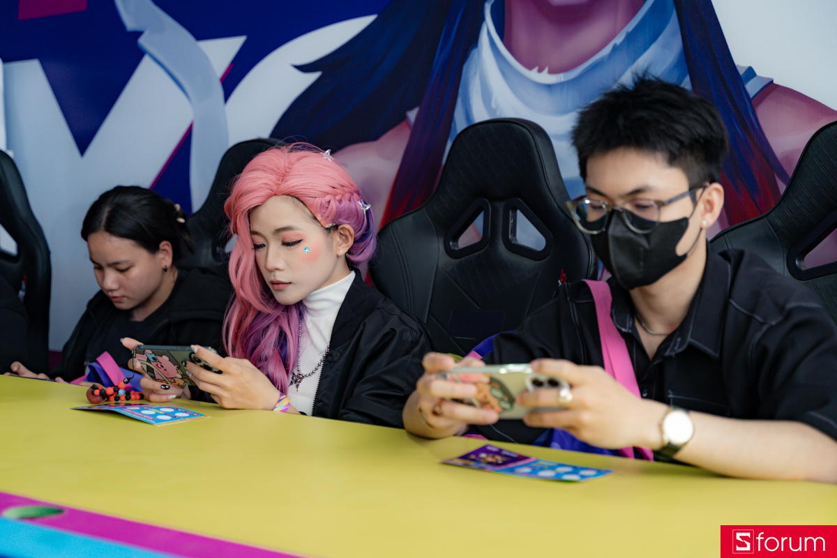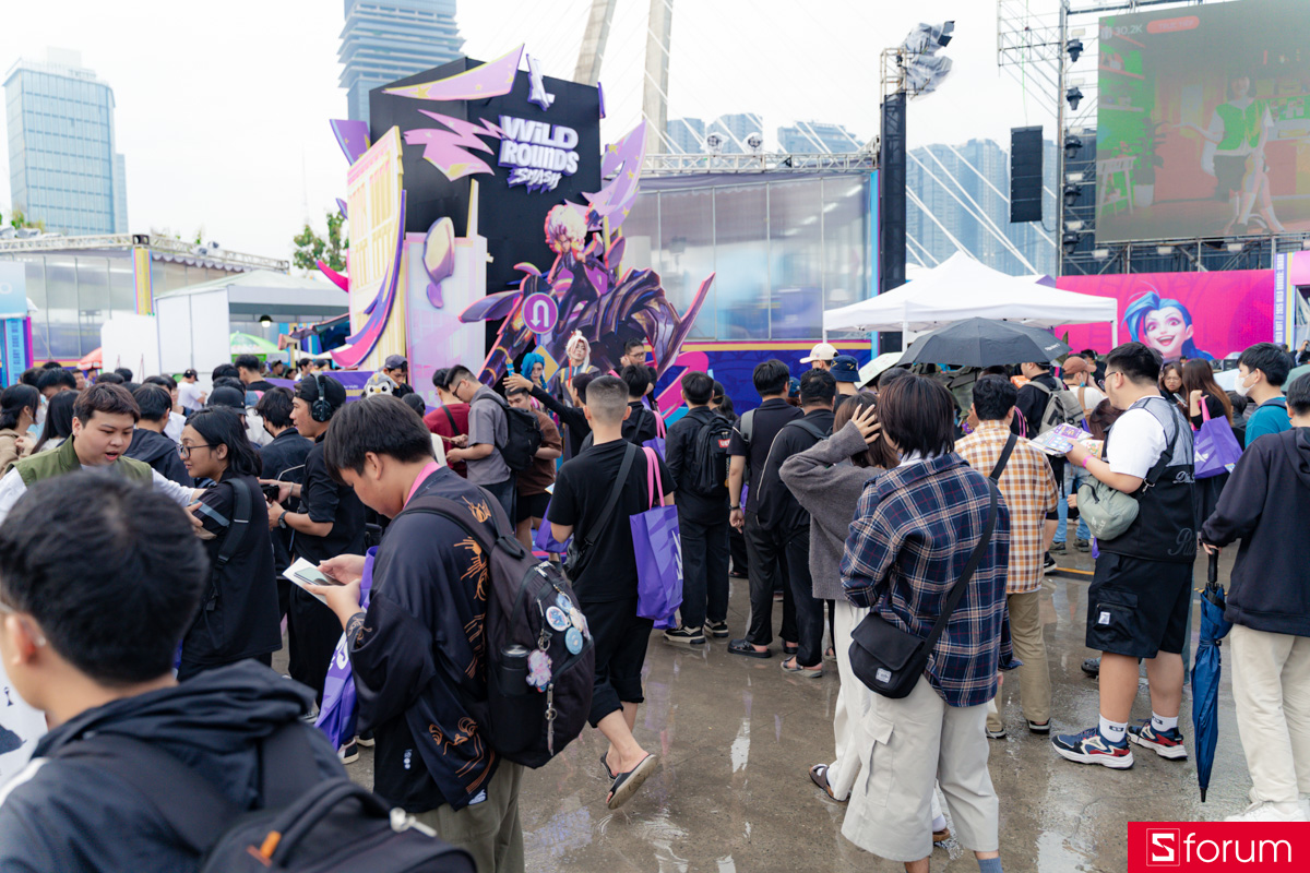 Ngay khi vừa bước vào cổng, Sforum đã phải ấn tượng trước cảnh tượng hàng trăm người xếp hàng dài để chụp ảnh check-in. Màn hình LED lớn, mô hình tướng khổng lồ và khu backdrop được thiết kế theo phong cách hiện đại của Wild Rift khiến ai cũng muốn dừng lại vài phút để ghi lại khoảnh khắc. Các quầy nhận quà tặng luôn trong tình trạng đông kín, tiếng gọi nhau í ới hòa cùng tiếng nhạc sôi động khiến không khí càng náo nhiệt hơn.